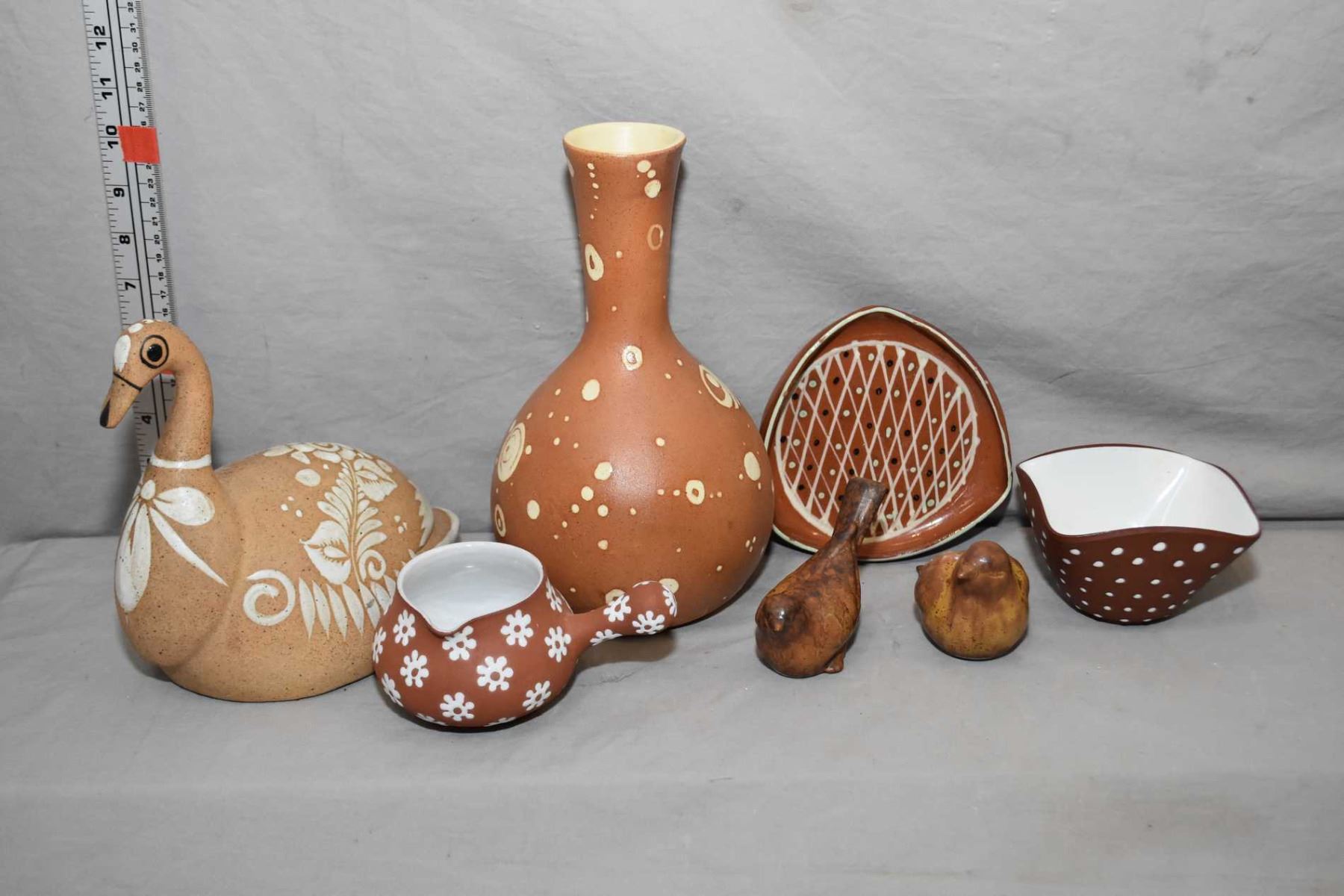 Selection of glazed pottery including large vase, swan, small sauce boat, a pair of birds etc.