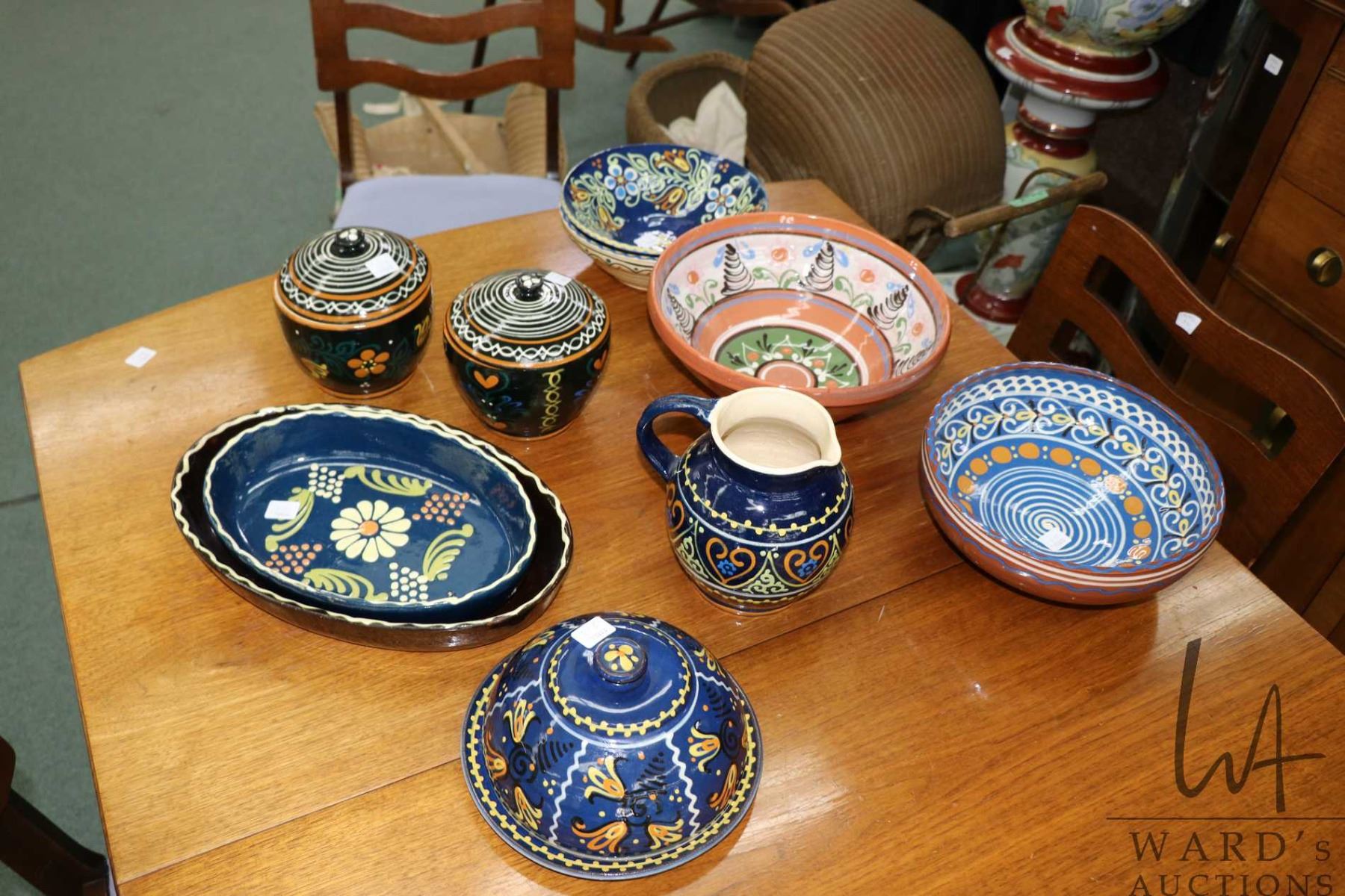 Selection of glazed pottery serving pieces including 11" and 13" casserole dishes, two 10" bowls, tw