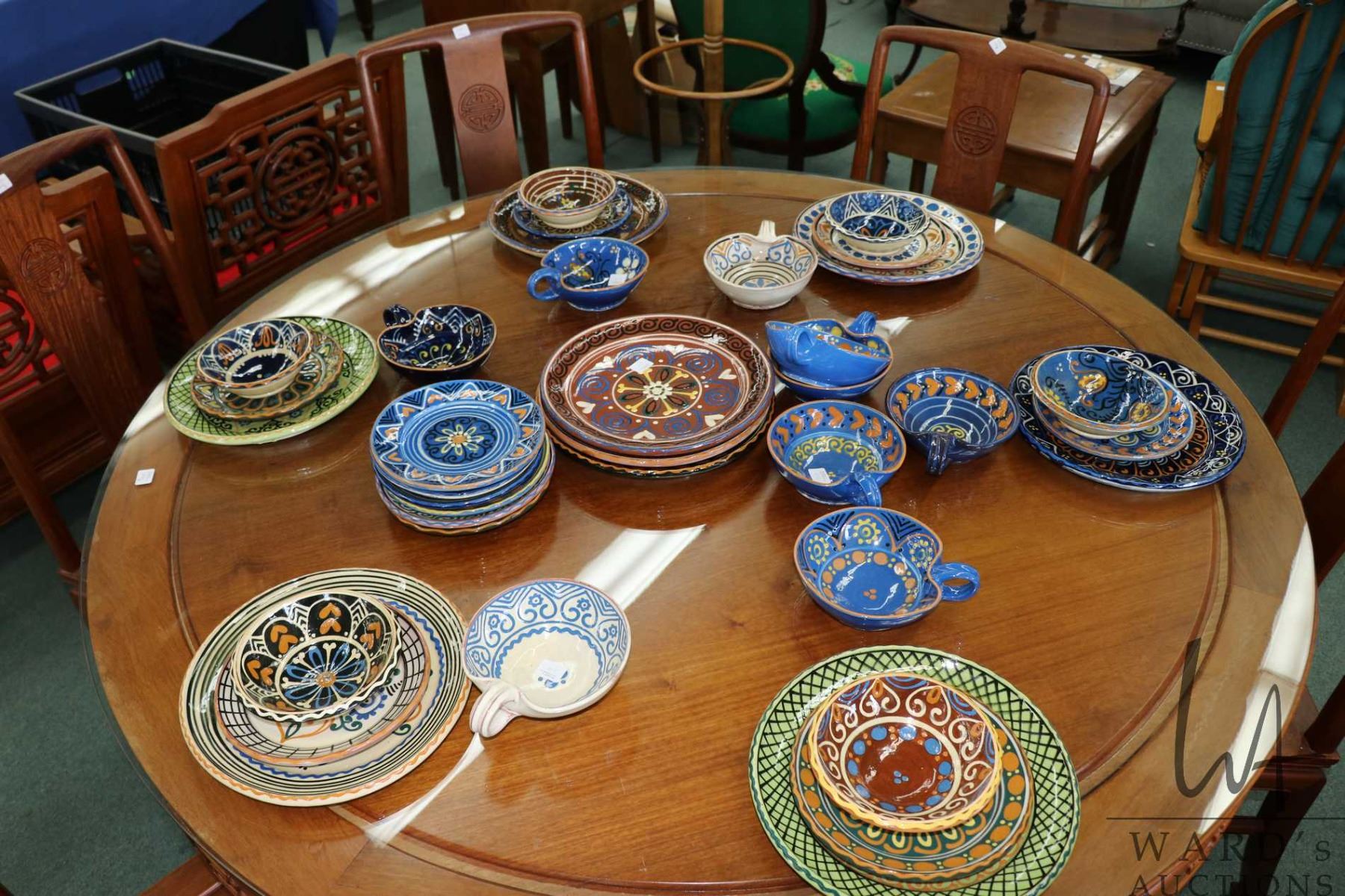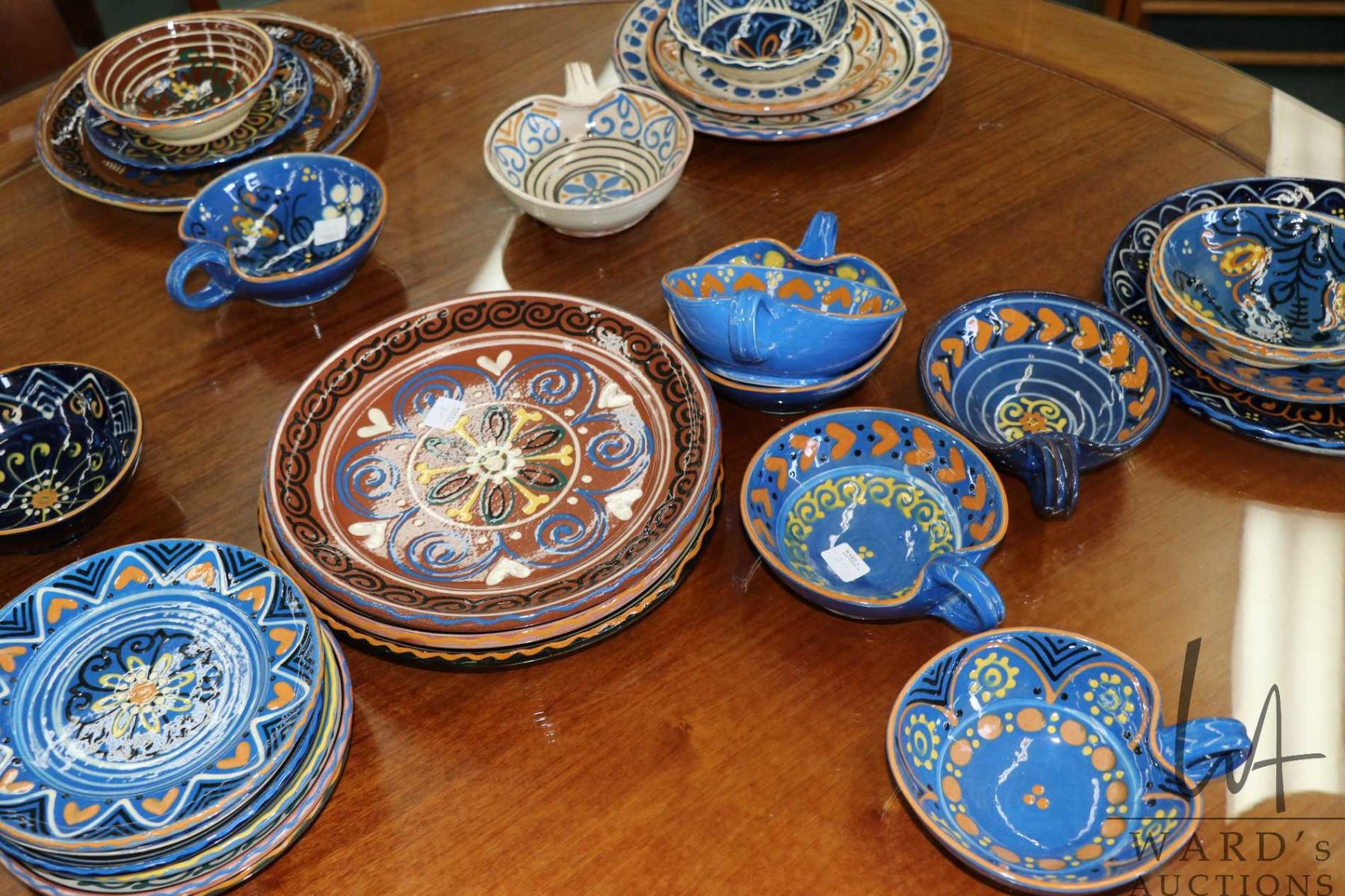 Selection of glazed pottery tableware including nine 10 1/2" plates, twelve 7" plates, six 5 1/2" bowls and nine soup bowls