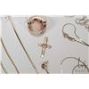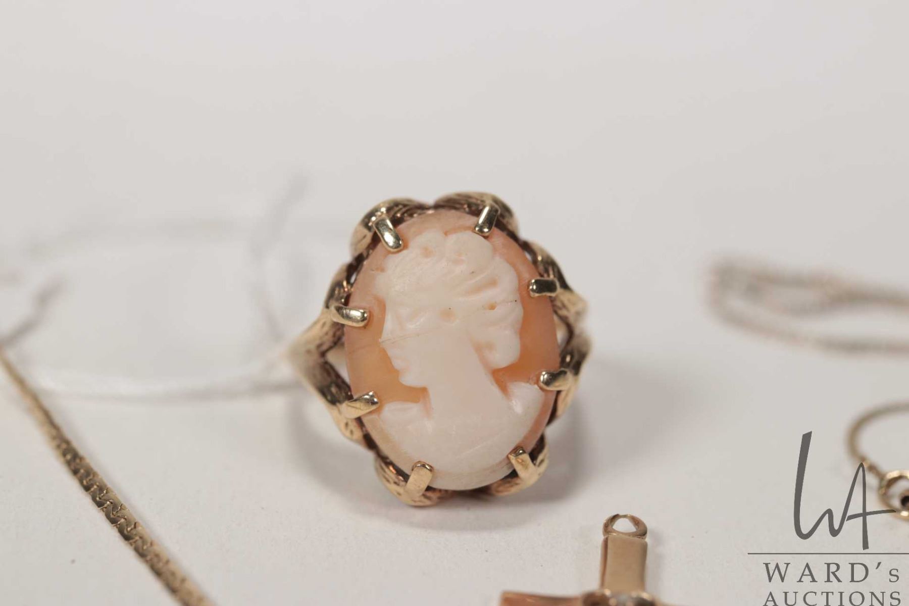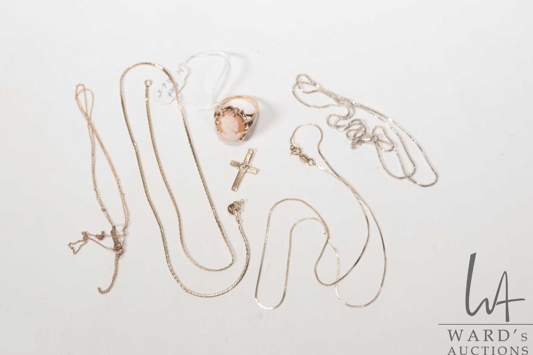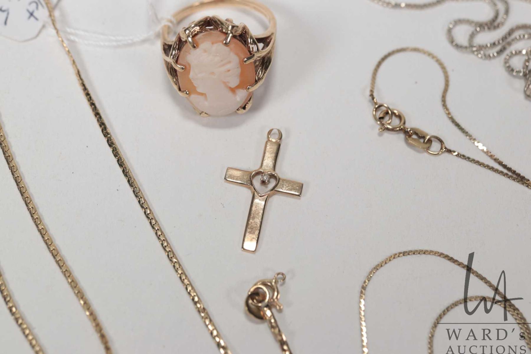 Selection of gold and silver jewellery including 10kt yellow gold and carved cameo ring, size 6.5, 10kt yellow gold 16" chain, small 10kt gold cross pendant, 10kt yellow gold 15" chain, very fine 10kt yellow gold 18" chain plus a18" sterling silver box chain