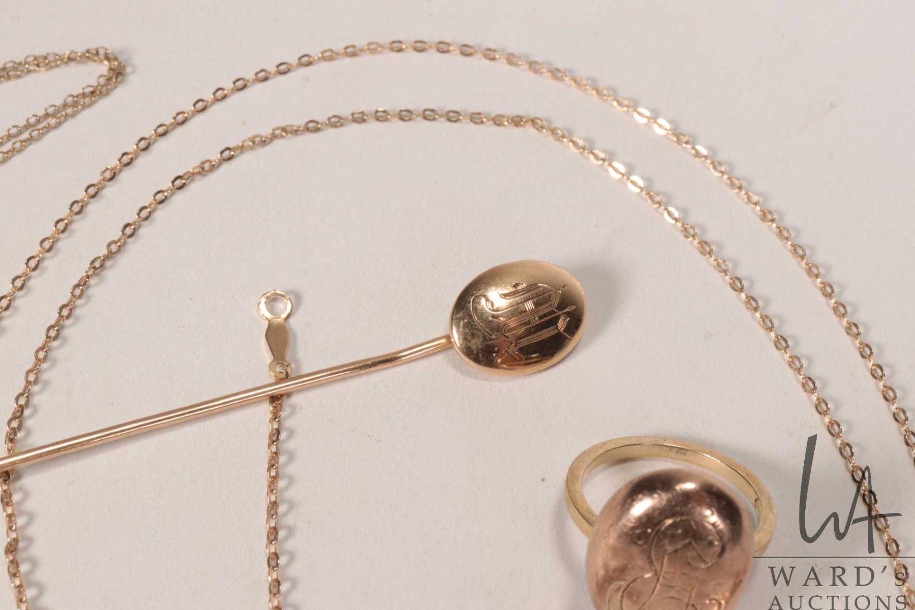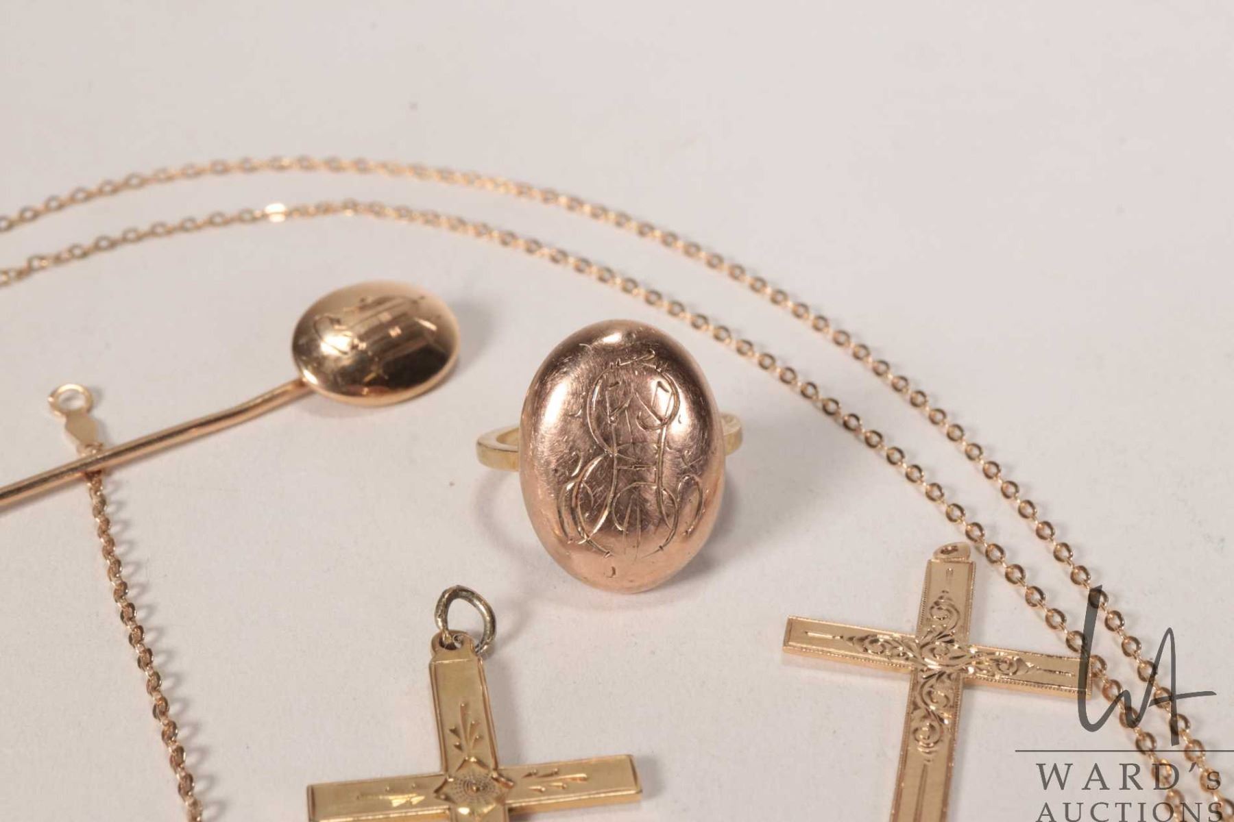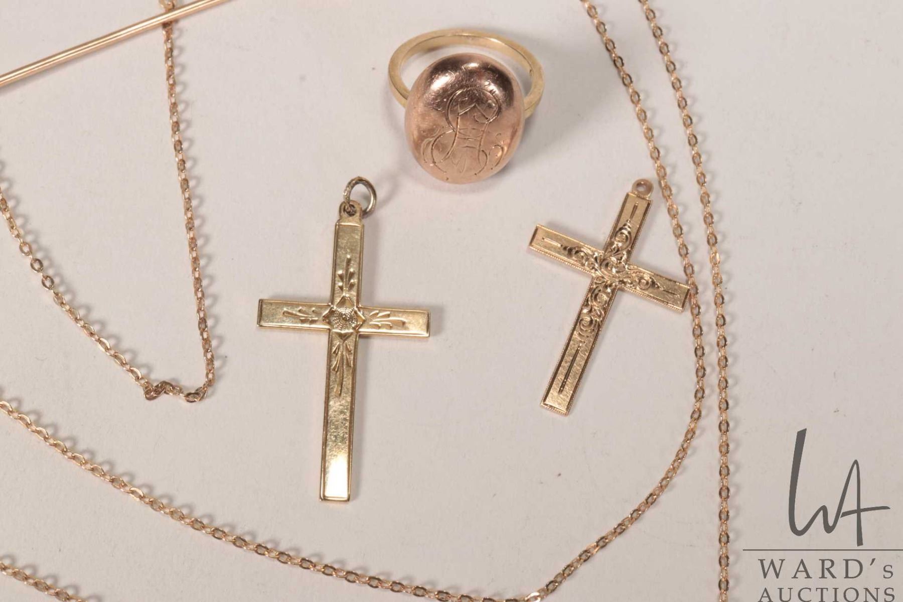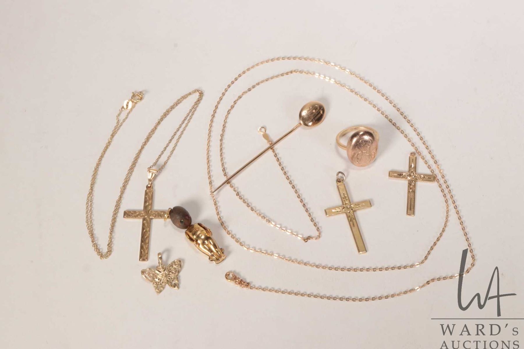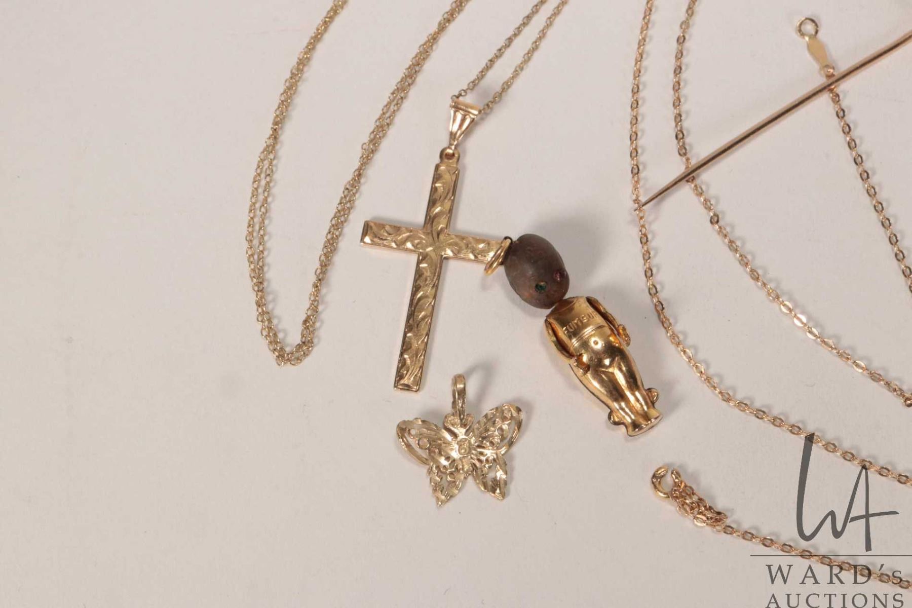 Selection of gold jewellery including 10kt 30" neck chain with broken clasp, three 10kt yellow gold cross pendants, one on vermeil neck chain, 10kt gold stick pin and matching ring plus a small gold filled, articulated kewpie charm/ pendant with wooden head and a 10kt yellow gold butterfly charm