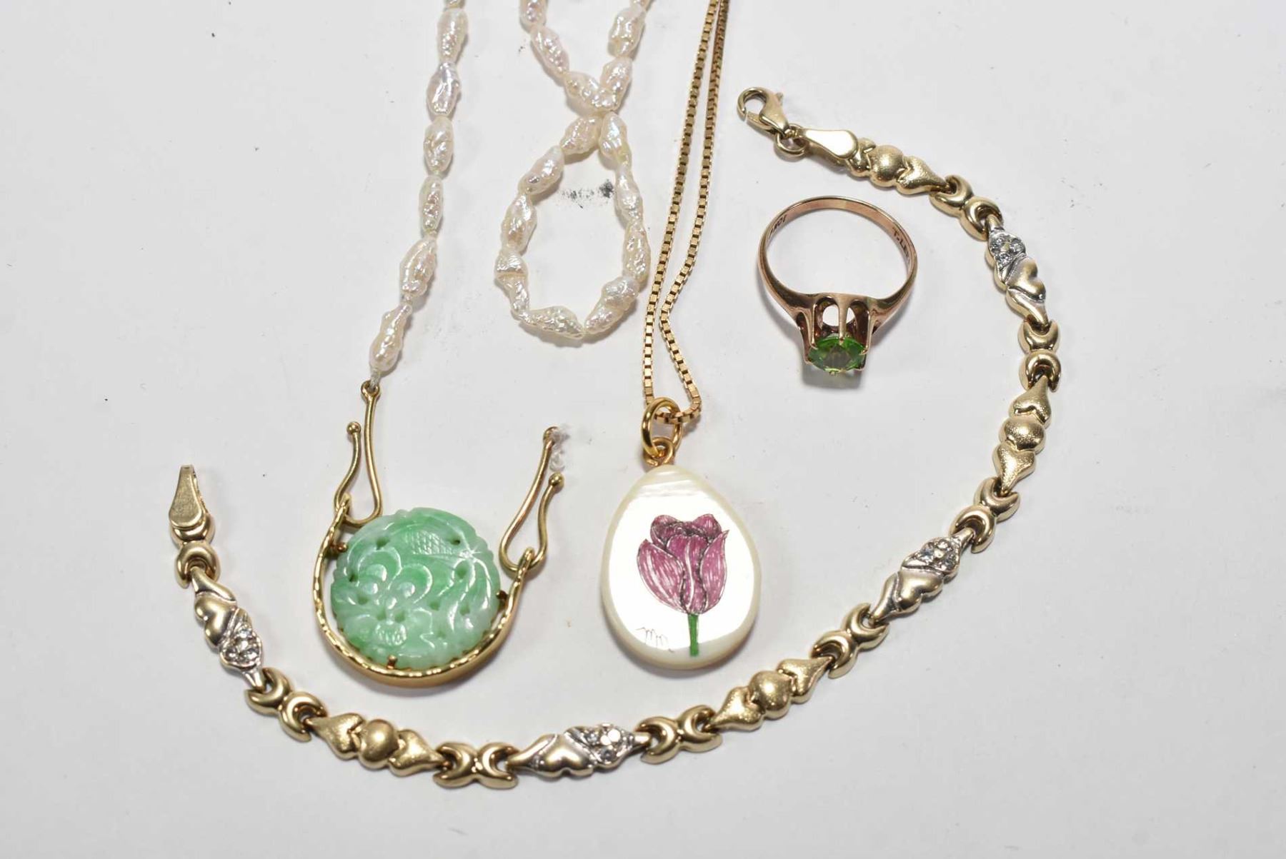 Selection of gold jewellery including 10kt gold bracelet set with small accent diamonds, 10kt gold ring set with faceted green gem like stone, jade and gold pendant marked 585 with attached fresh water pearl necklace, note needs reattaching on one side and a 10kt yellow gold box chain with attached scrimshaw flower pendant