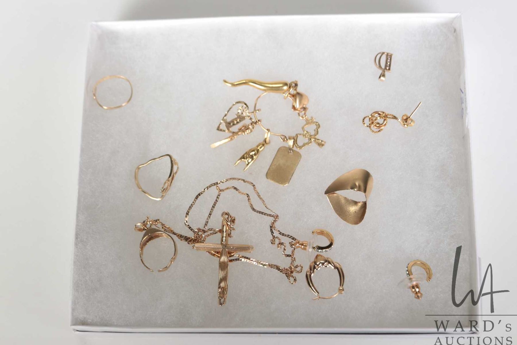 Selection of gold jewellery including 10kt yellow gold 19" neck chain, selection of 10kt gold charms, pair of marked 14kt yellow gold earrings set with clear stones, some broken gold rings, single earrings etc.