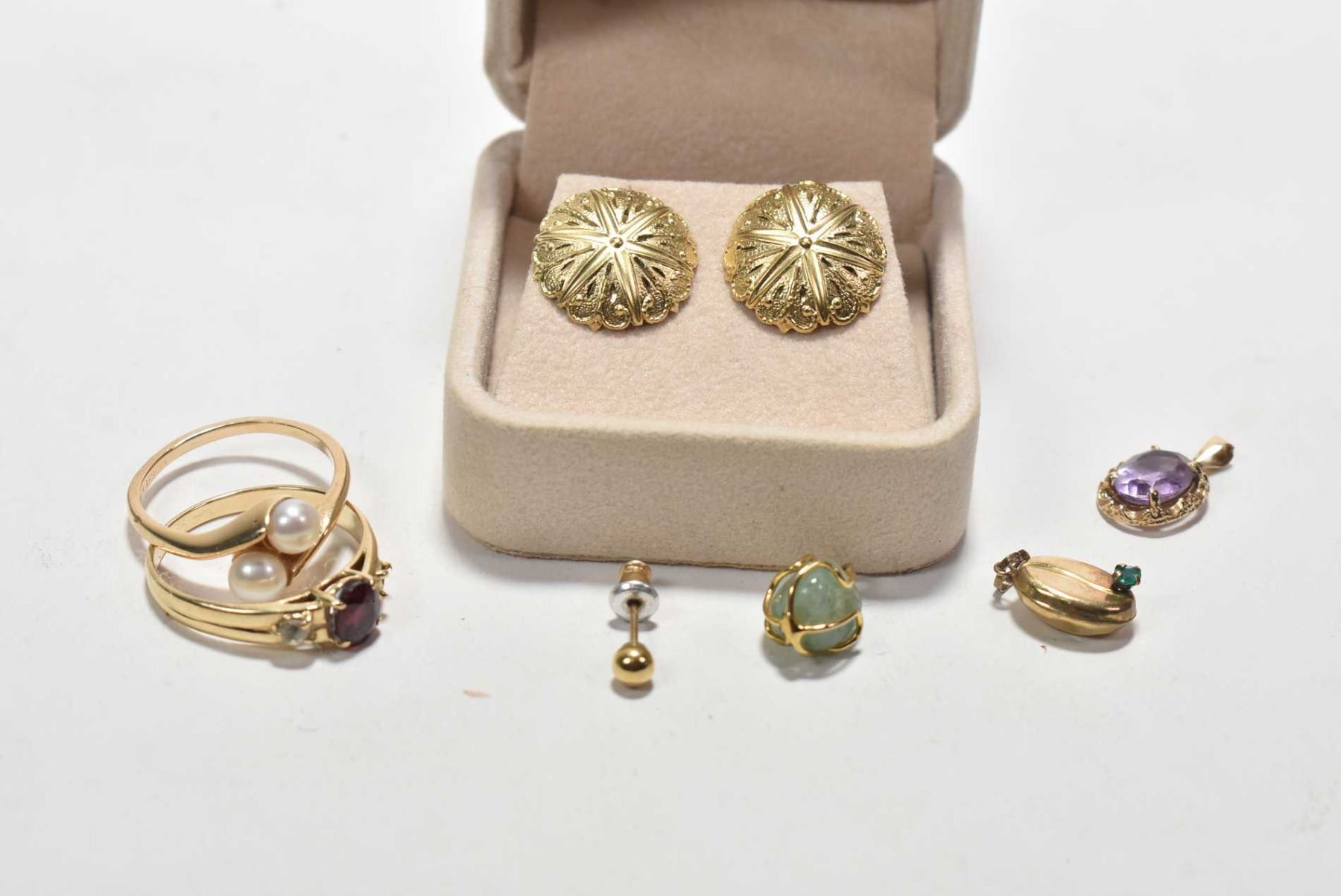 Selection of gold jewellery including earrings, 10kt gold ring set with gemstone (note missing one stone), 10kt yellow gold double pearl rings, three pendants etc.