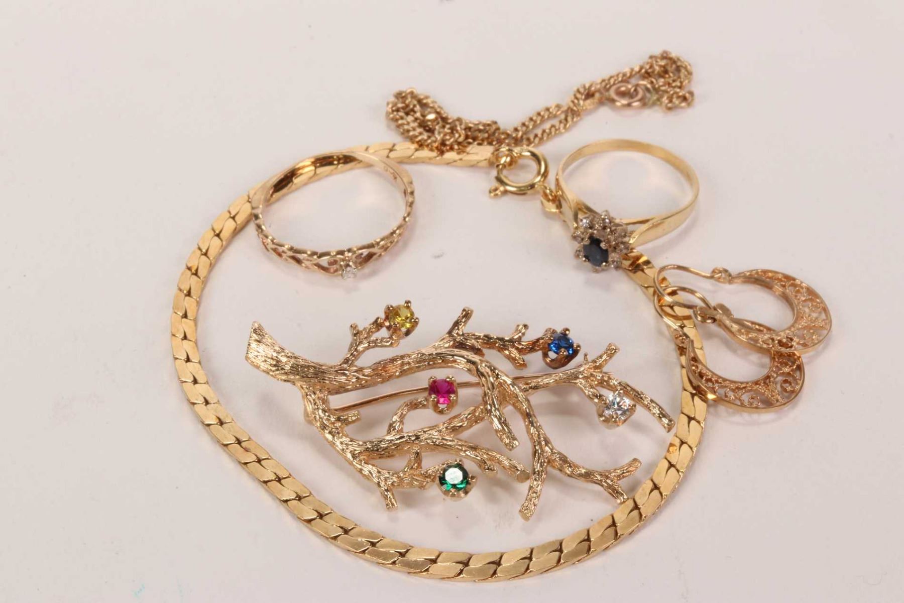 Selection of gold jewellery including ladies 10kt yellow gold tree motif gemstone brooch, two10kt gold bracelets, a small gold ring set with single diamond, a pair of filigree earrings and a 10kt yellow gold sapphire and diamond cluster gemstone ring