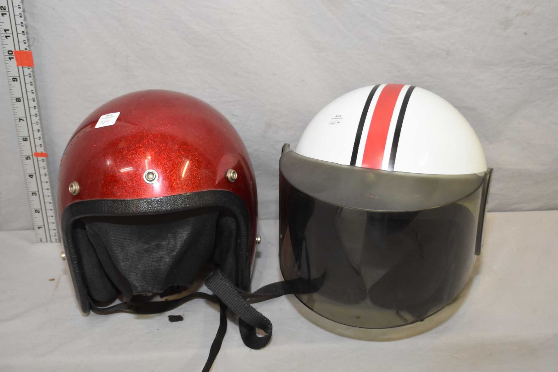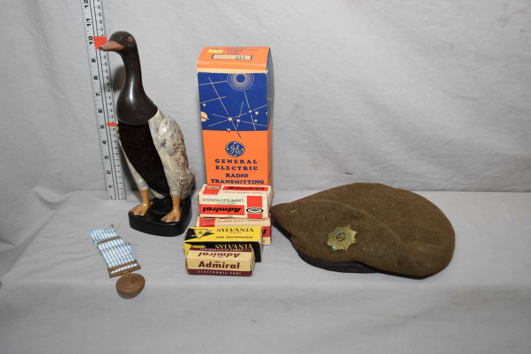 Selection of guy's items including two vintage motorcycles helmets, a 1944 Royal Canadian Army Service Corps. beret, Korean UN medal, selection of radio tubes and duck motif clothes brush