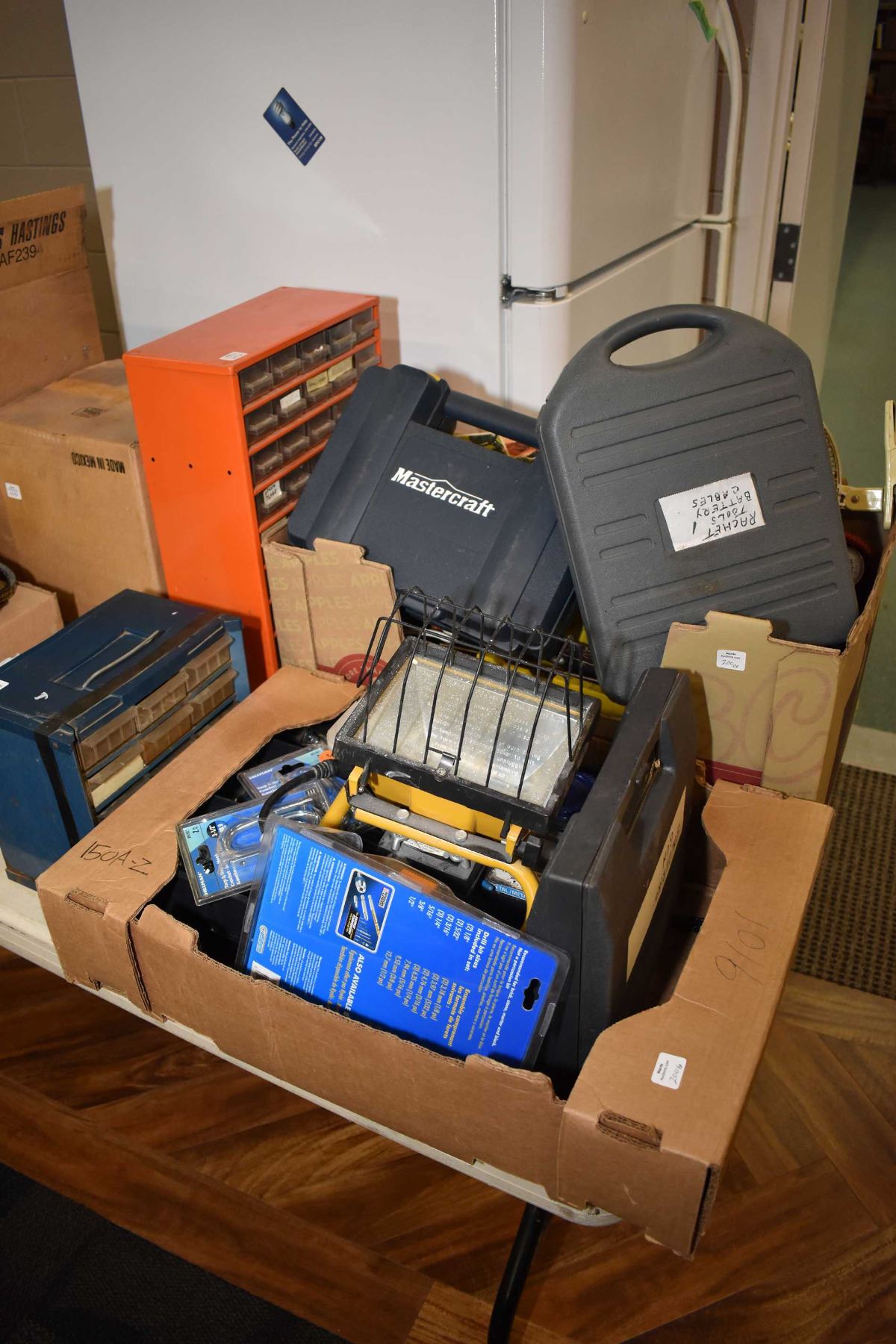 Selection of hand and power tools including soldering iron and sander plus a large selection of hardware