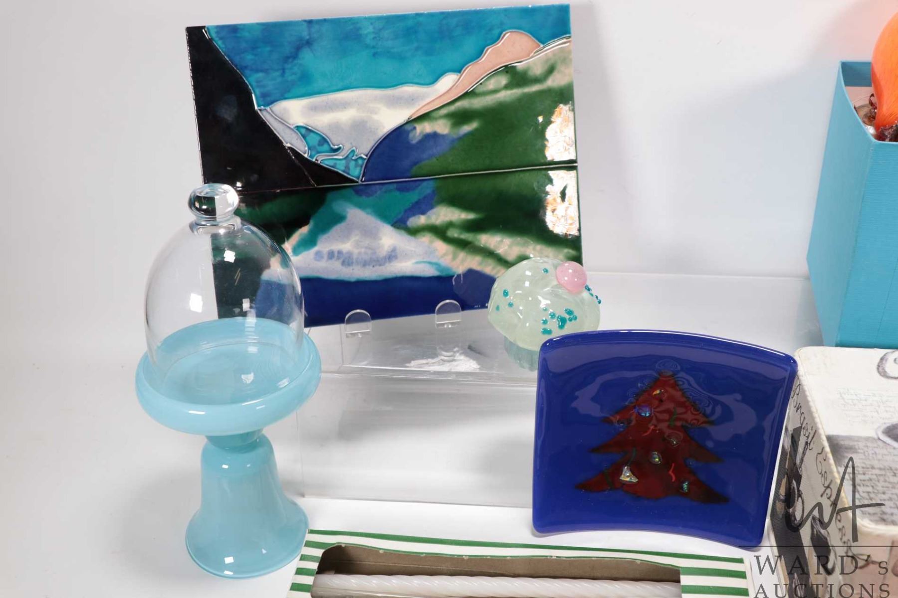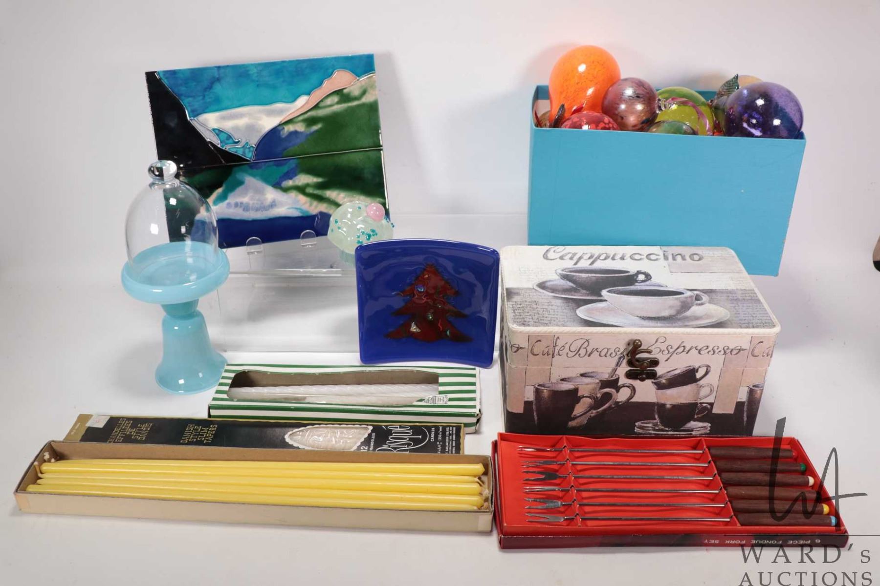 Selection of hand blown ornaments including fruit, glass dome on stand plus fondue forks, brass napkins rings, candles etc.