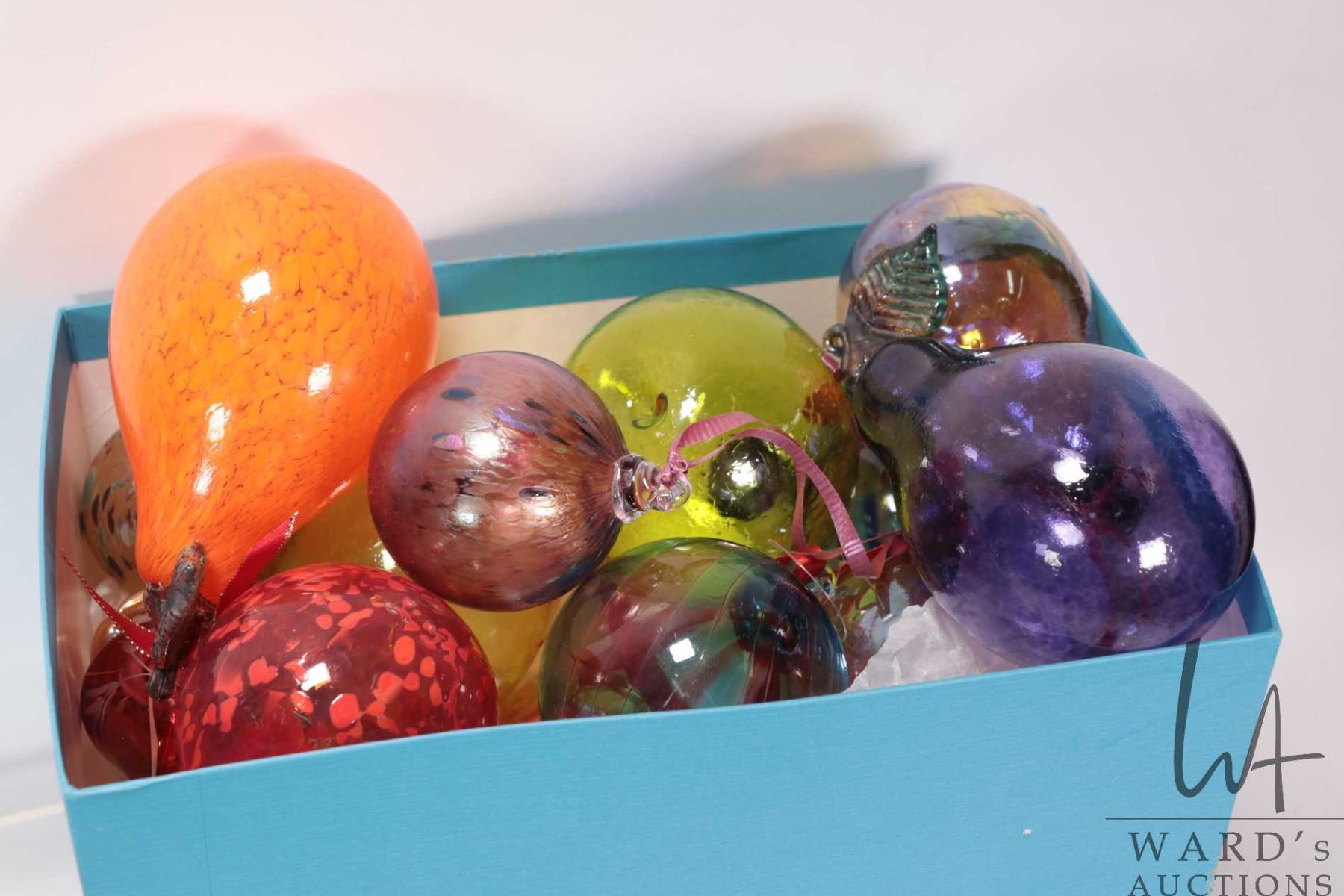 Selection of hand blown ornaments including fruit, glass dome on stand plus fondue forks, brass napk