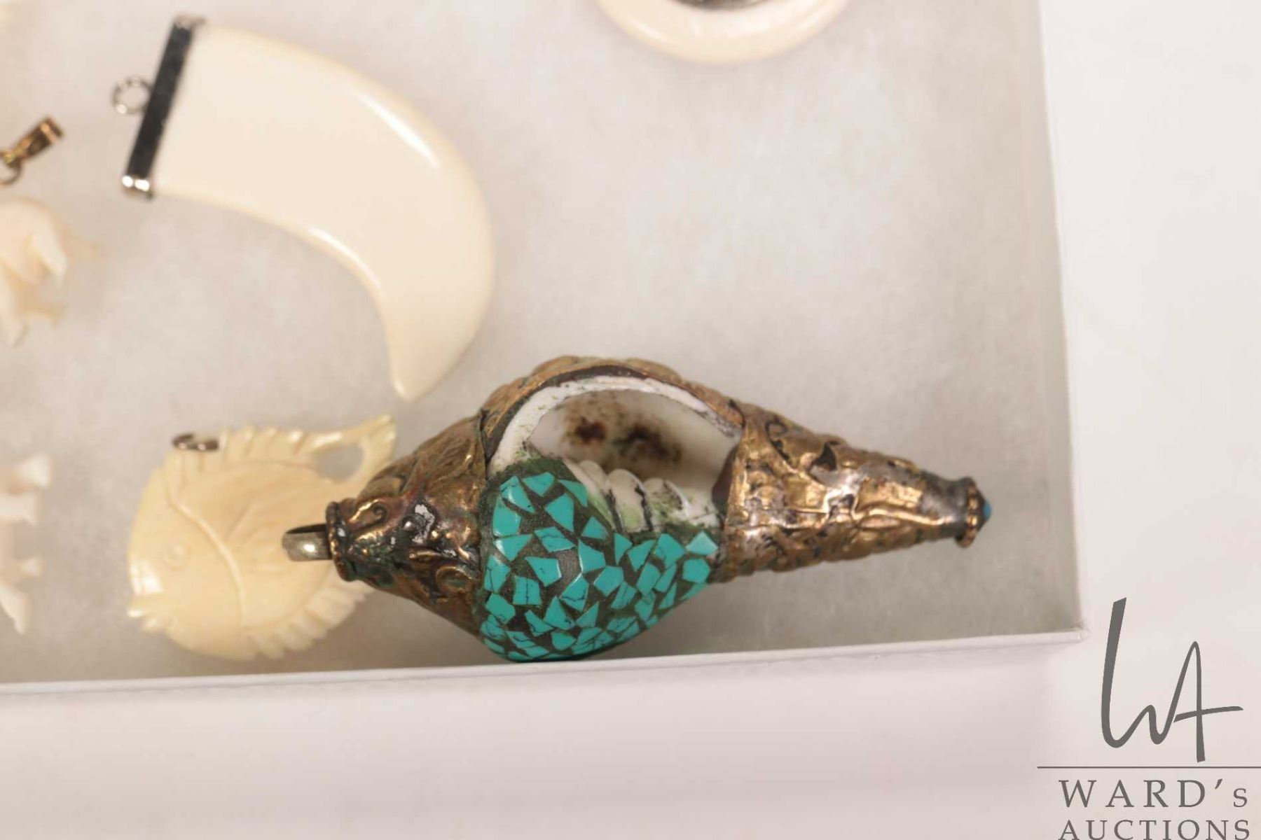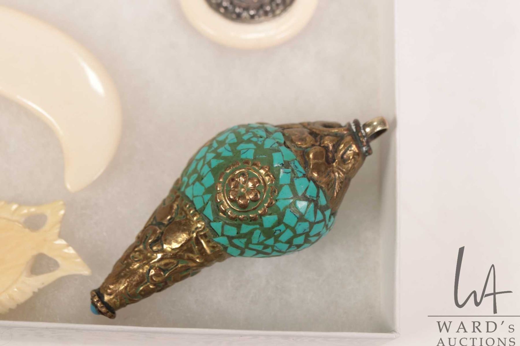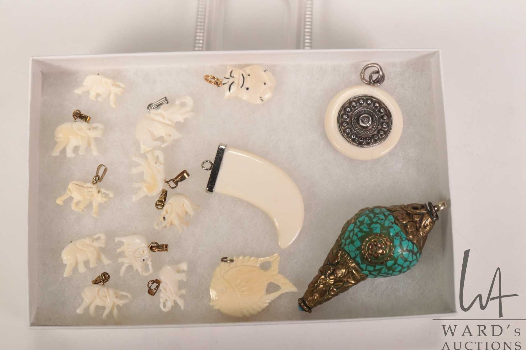 Selection of hand carved miniature elephant pendants, decorative seashell pendant with applied stones, tooth style pendant, round Indian decorative pendant, fish etc. Can not be shipped outside of Canada. Canadian buyers only.