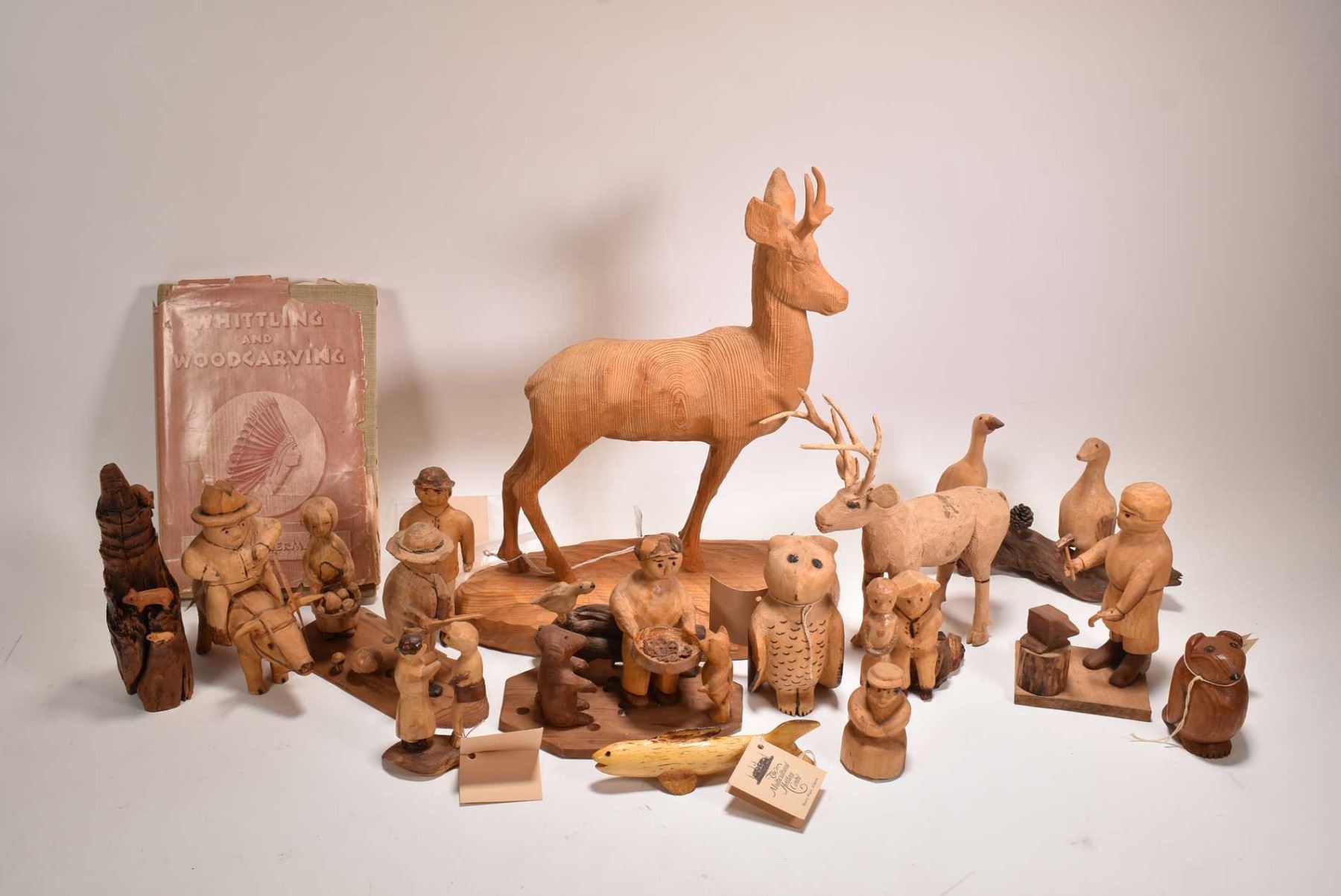 Selection of hand carved wooden figures including Pronghorn Antelope by artist Bill Litzenburger 14" in height, plus assorted animals and figures, some artist signed and a hardcover volume of Whittling and Woodcarving by E.J. Tangerman