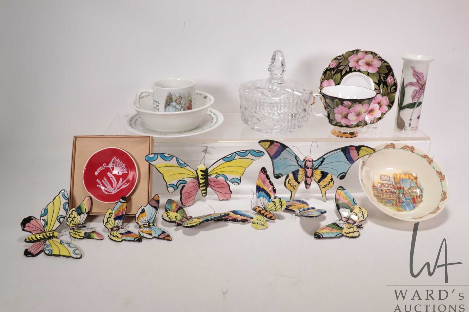 Selection of hand painted ceramic butterflies, Royal Albert cup and saucer, Wedgwood Peter Rabbit an