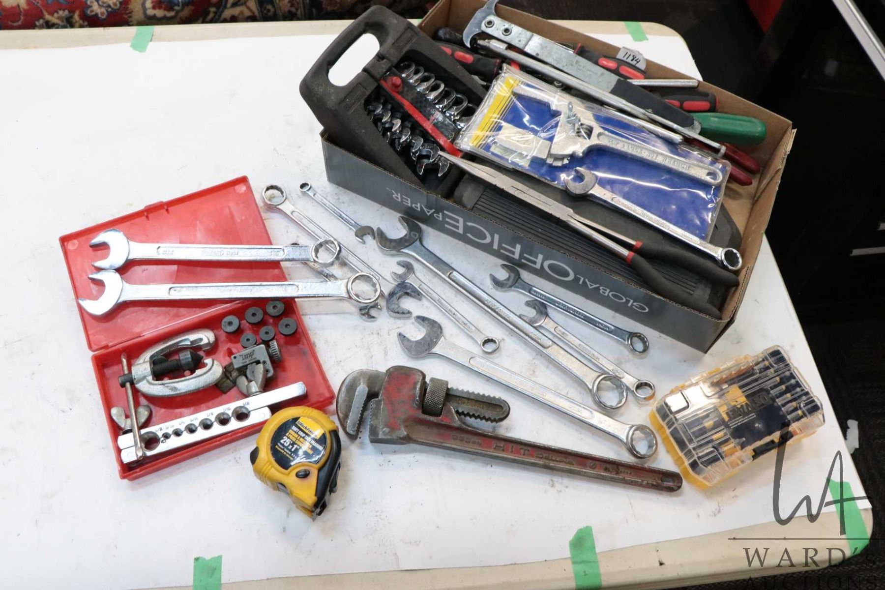 Selection of hand tools including adjustable wrenches, combination wrenches, pipe wrench, ratcheting wrenches, screwdrivers, seal puller, tube flaring kit, pliers, DeWalt bits etc.