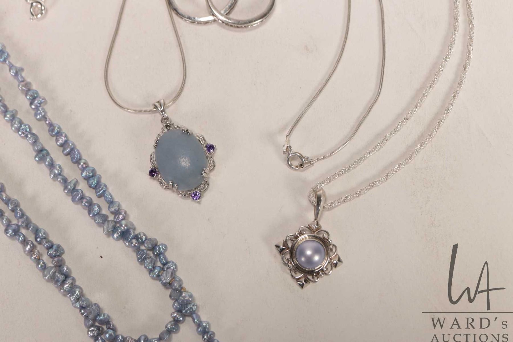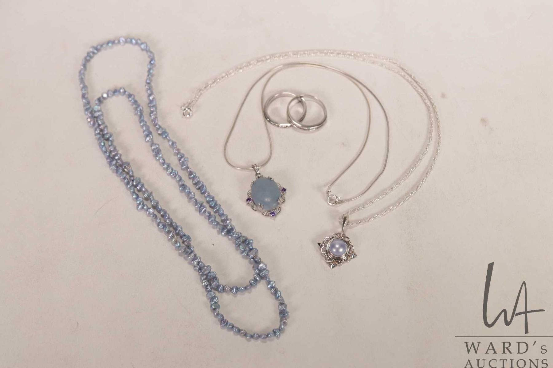 Selection of jewellery including sterling silver and blue pearl like stone pendant on 22" sterling silver neck chain, two channel set rings, sterling silver and polished stone pendant on sterling 18"k chain and a 30" blue pearl necklace