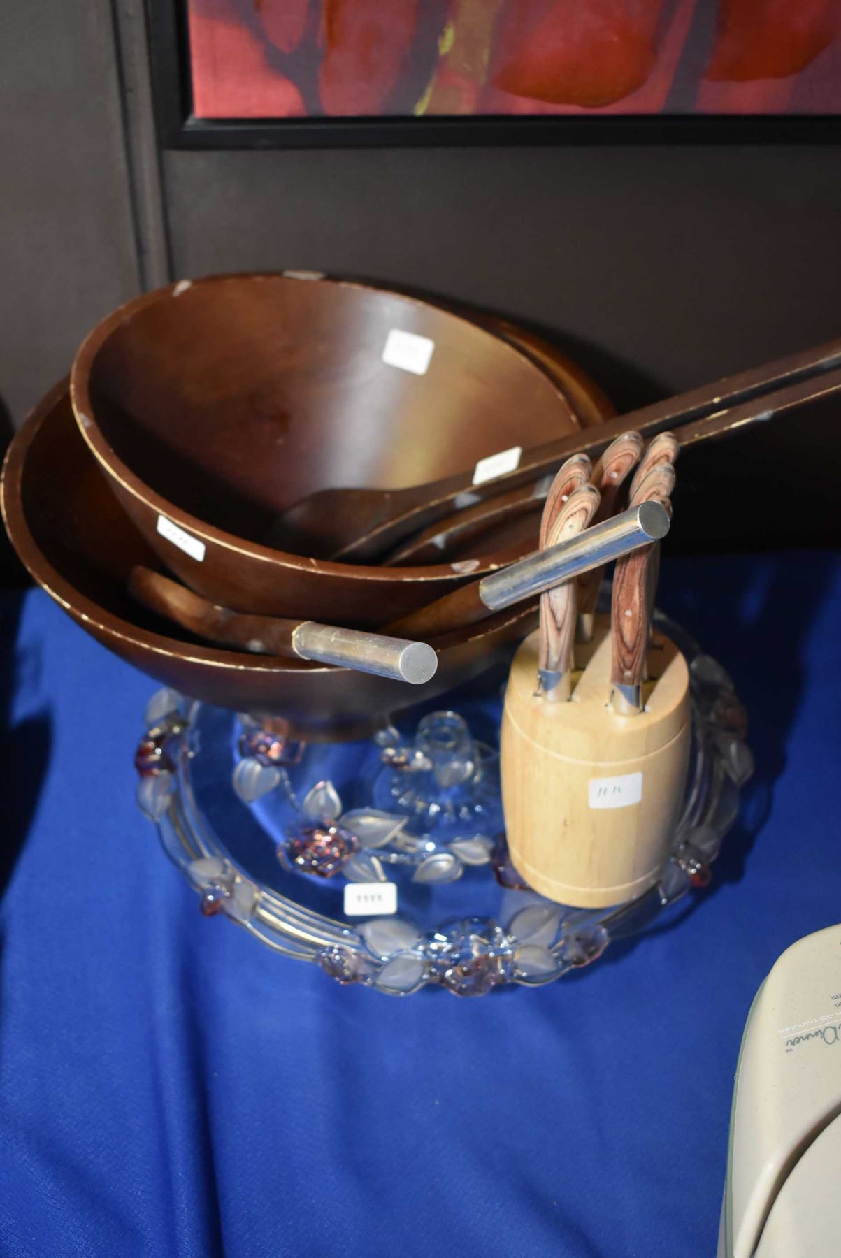 Selection of kitchen items including cake plate, steak knives and salad bowls