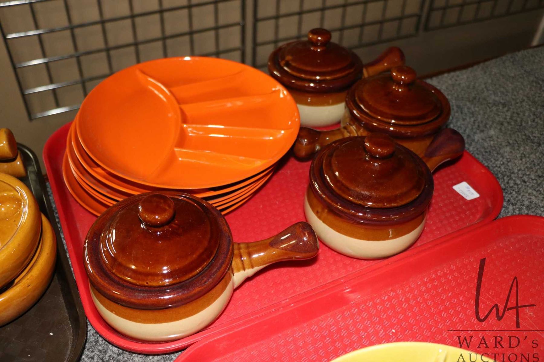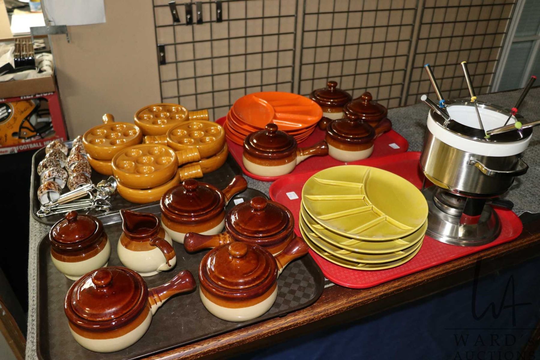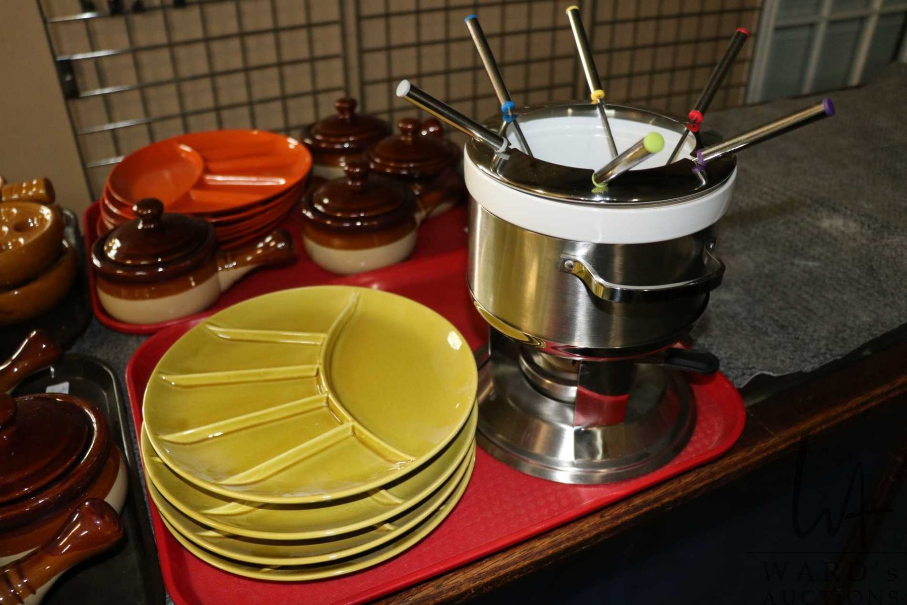 Selection of kitchen ware including eight lidded onion soup dishes, eight escargot dishes with four stainless steel escargot tongs, ten seashell napkin holders and a selection of melamine and pottery divided plates plus a fondue pot with forks and spirit burner