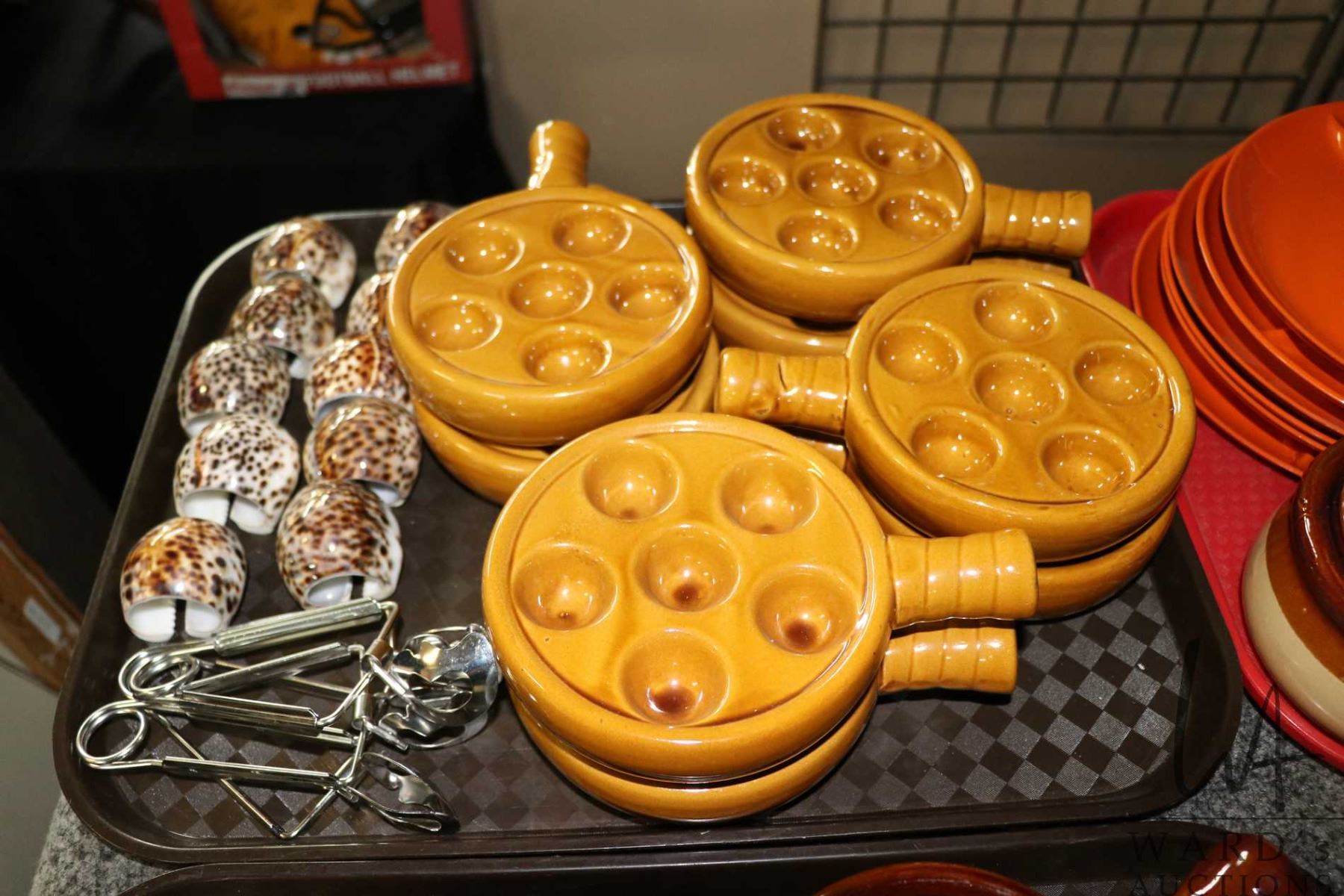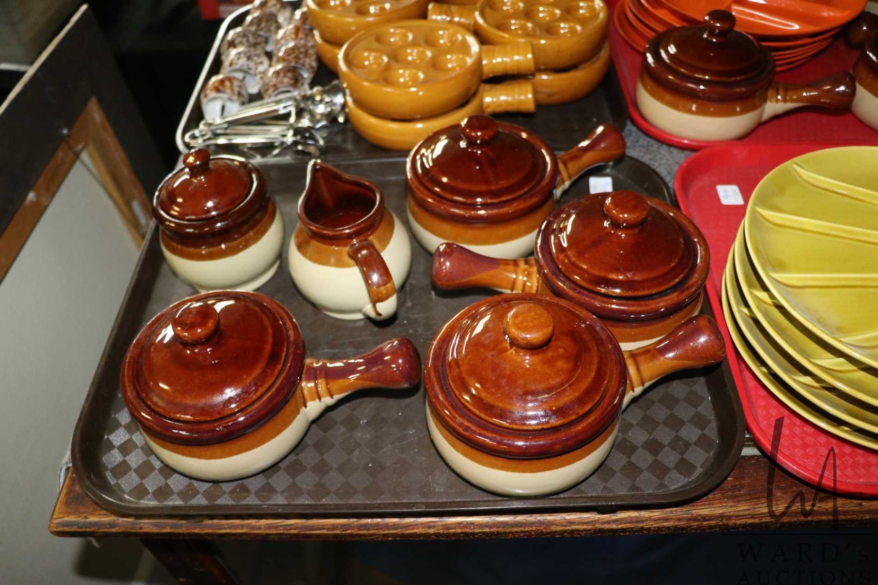 Selection of kitchen ware including eight lidded onion soup dishes, eight escargot dishes with four