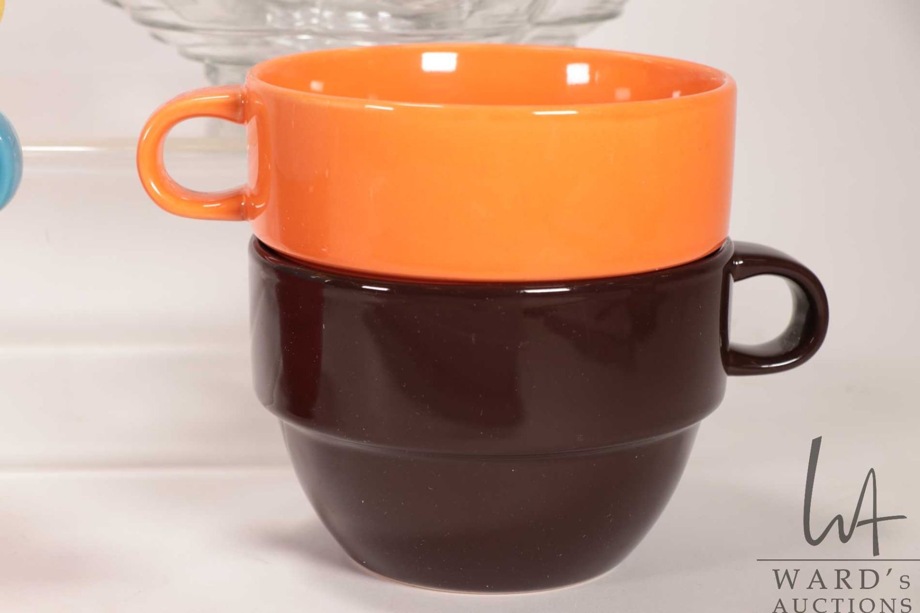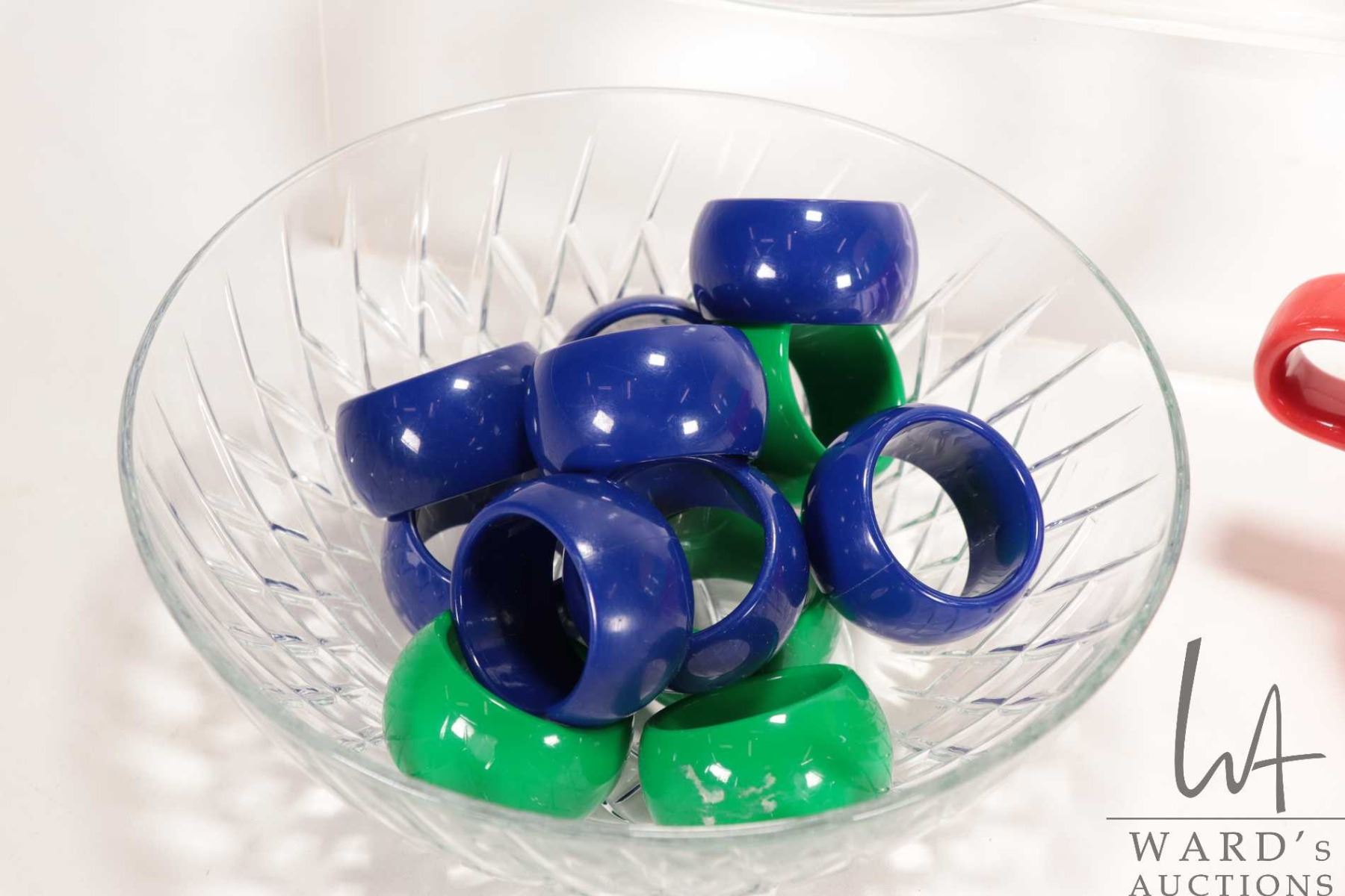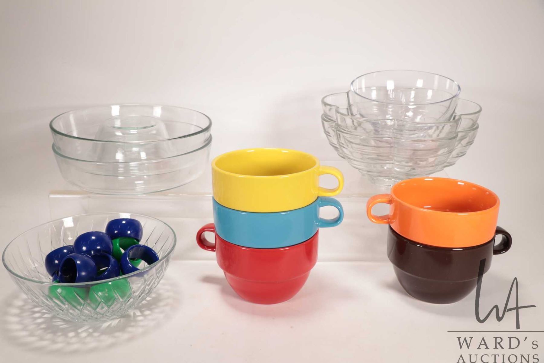 Selection of kitchenware including two vintage PYREX ring molds, two flower shaped clear bowls, crystal bowl, clear footed bowl a selection of napkin rings and five Pier One soup bowls with handles