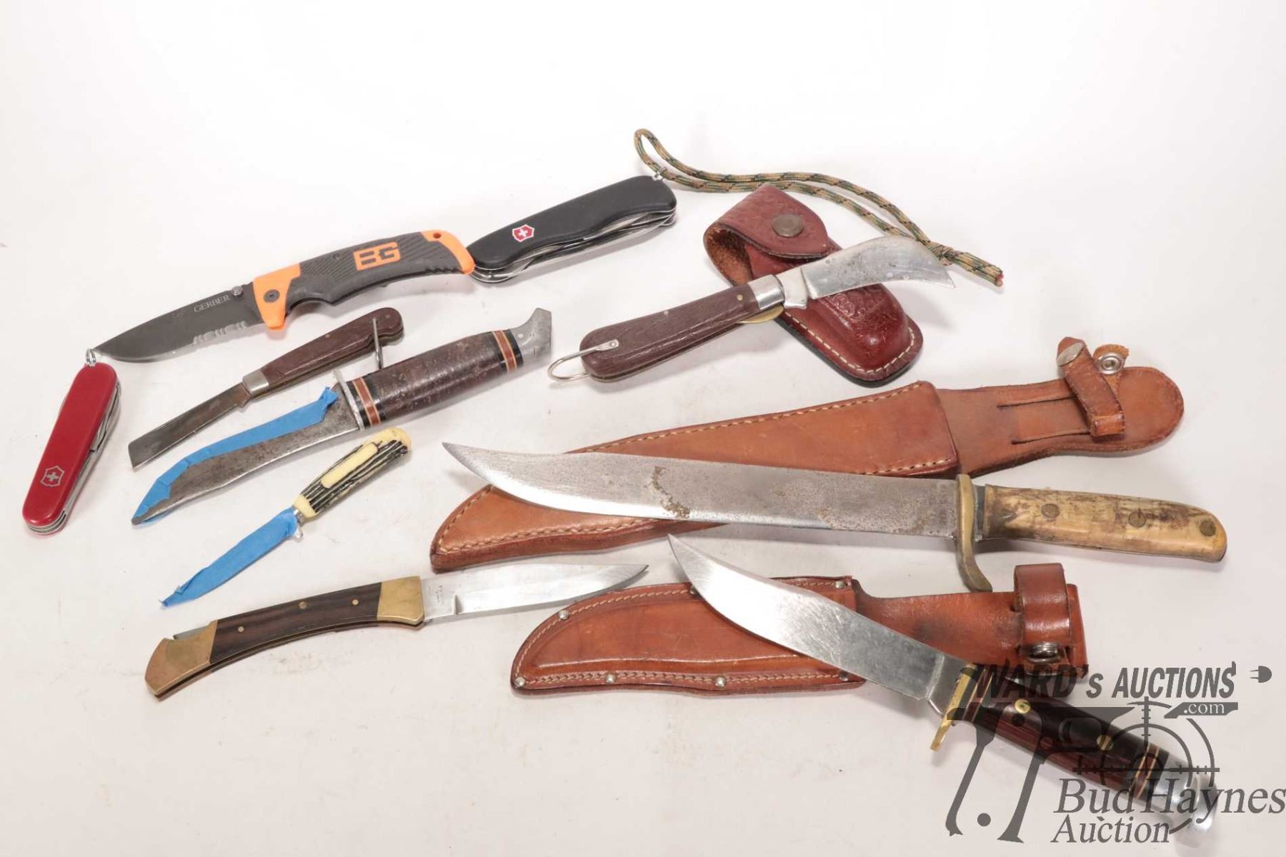 Selection of knives including 5 1/2" hunting Selection of knives including 5 1/2" hunting knife, 9" hunting knife, 4 1/2" hunting knife and 5 assorted folding knives