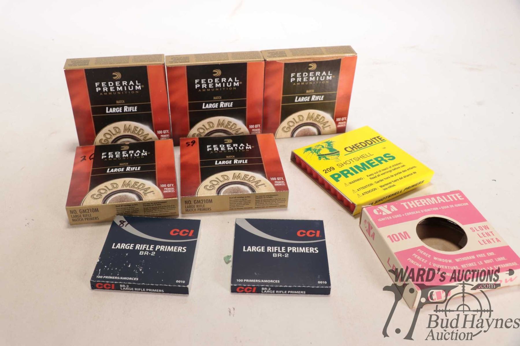 Selection of large rifle primers including .385 Federal Premium, 181 count CCI No. BR-2 and 86 count Cheddite 209 shot shell primers, plus a packet of Thermalite igniter cord