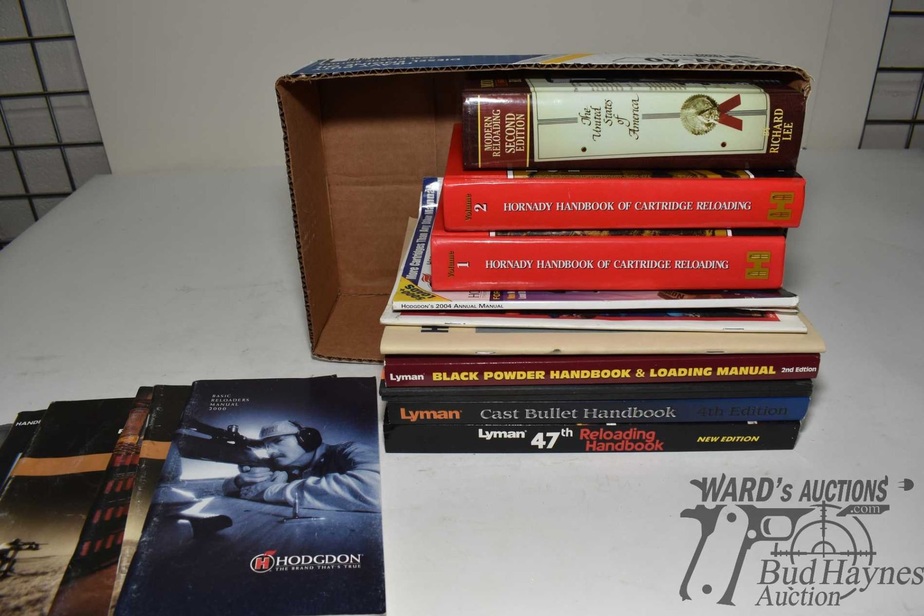 Selection of loading books including hardcover Hornady volumes 1 & 2, Lyman, Bullet casting, Modern