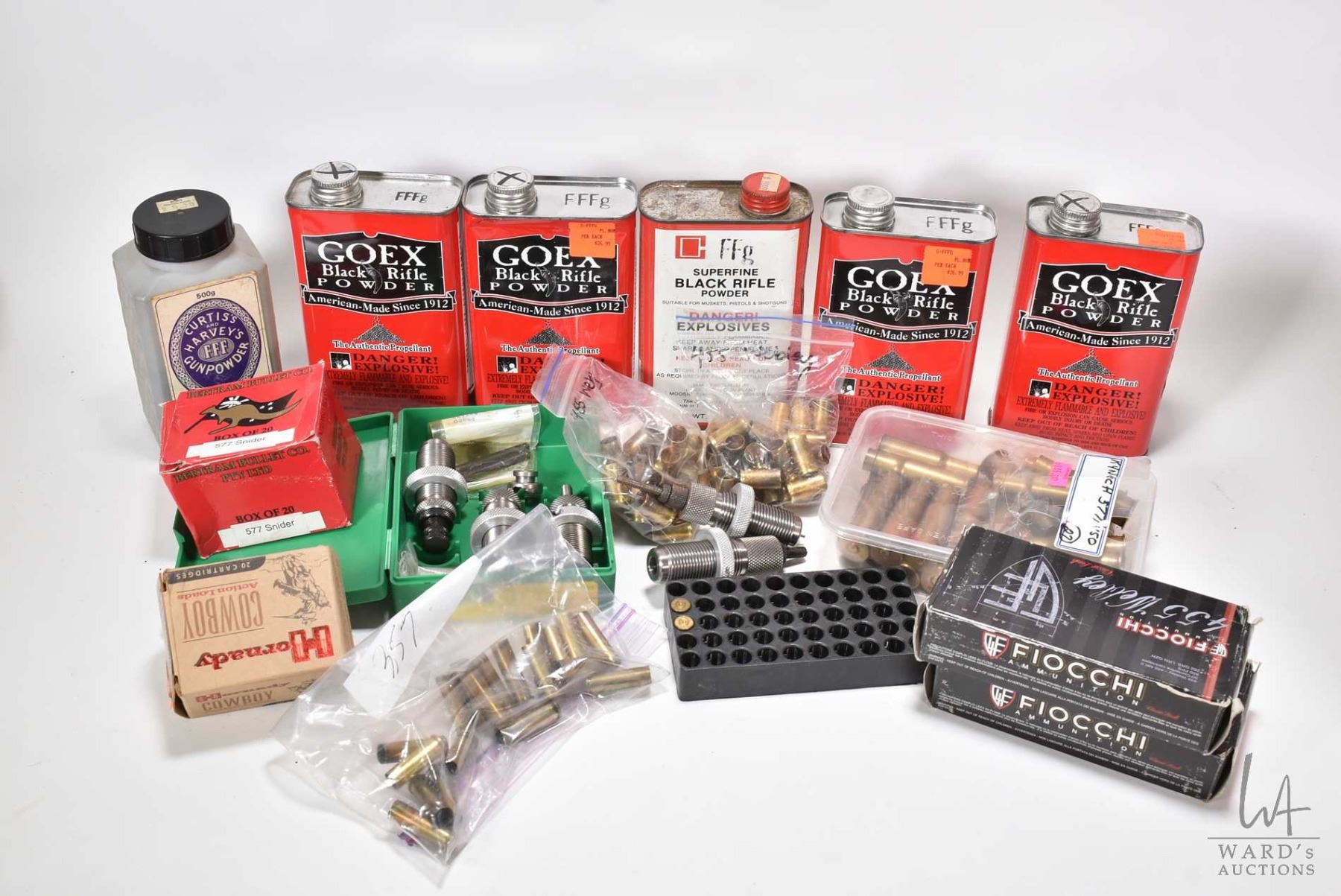 Selection of loading equipment including .577 Snider loading brass, 455 Webley brass, Kynoch 477/450 brass, RCBS .32 auto die set, 223 die set and four and a half tins of Goex Black rifle powder, 1/2" canister of Curtis's and Harvery's Gun powder etc.