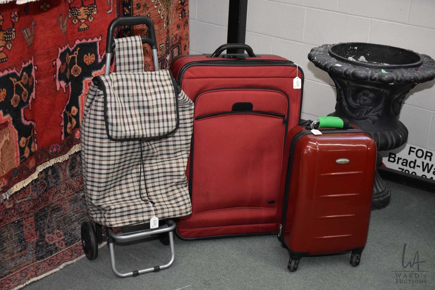 Selection of luggage including hard Samsonite case, soft rolling suitcase and a cart with wheels. Note: No Shipping. Local Pickup Only
