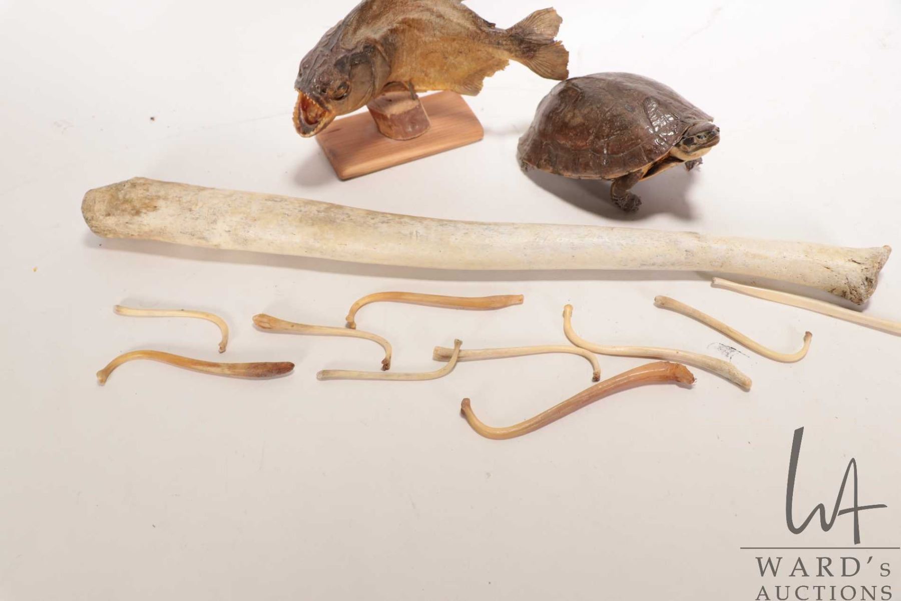 Selection of mammal baculum (penis bones) ranging from 3" to 18" ( possibly walrus), a 7" piranha and a 6" turtle