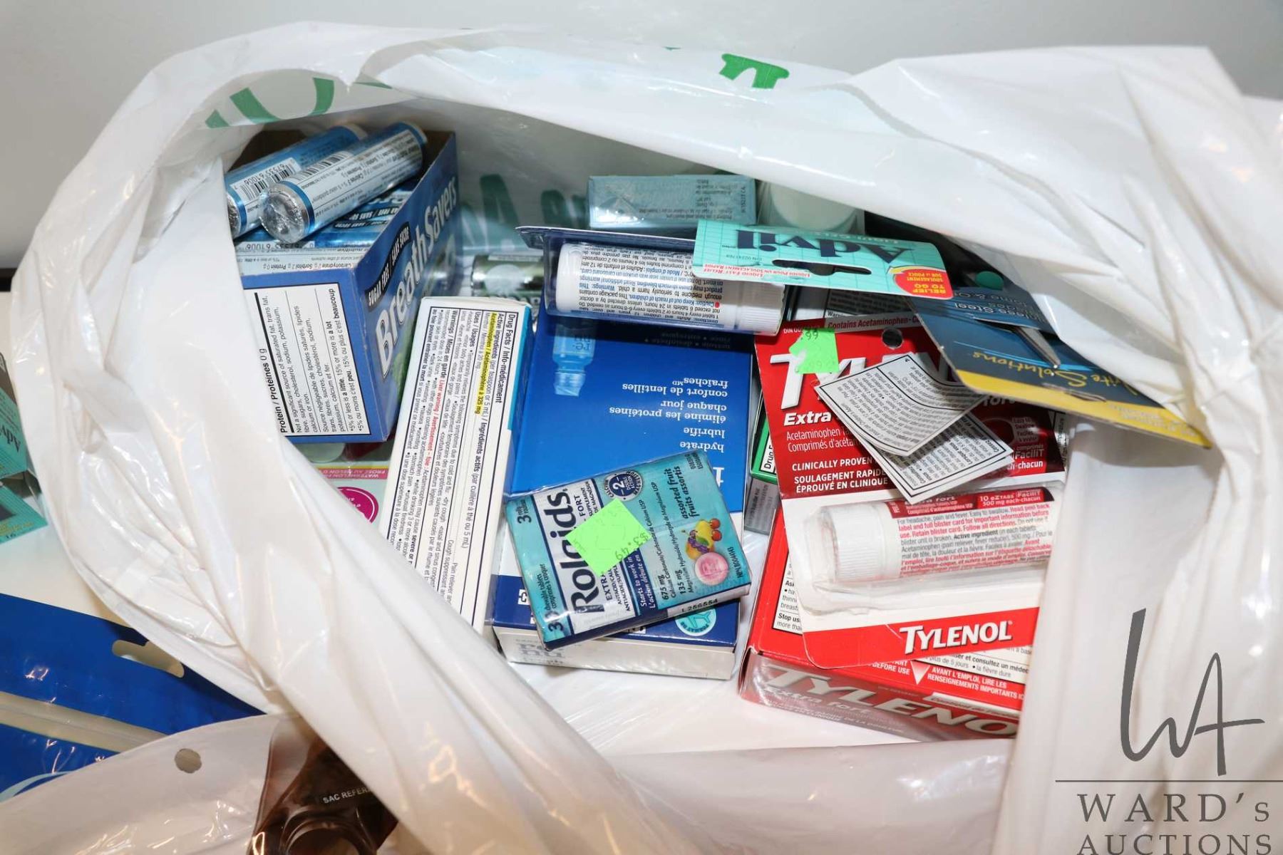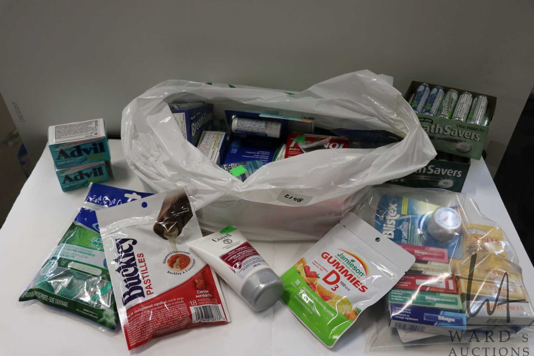 Selection of medical items including Advil liquid gels, Tylenol, Buckleys lozenges, Rolaids, contact lens lubrication, Breath Savers, assorted Blistex, etc