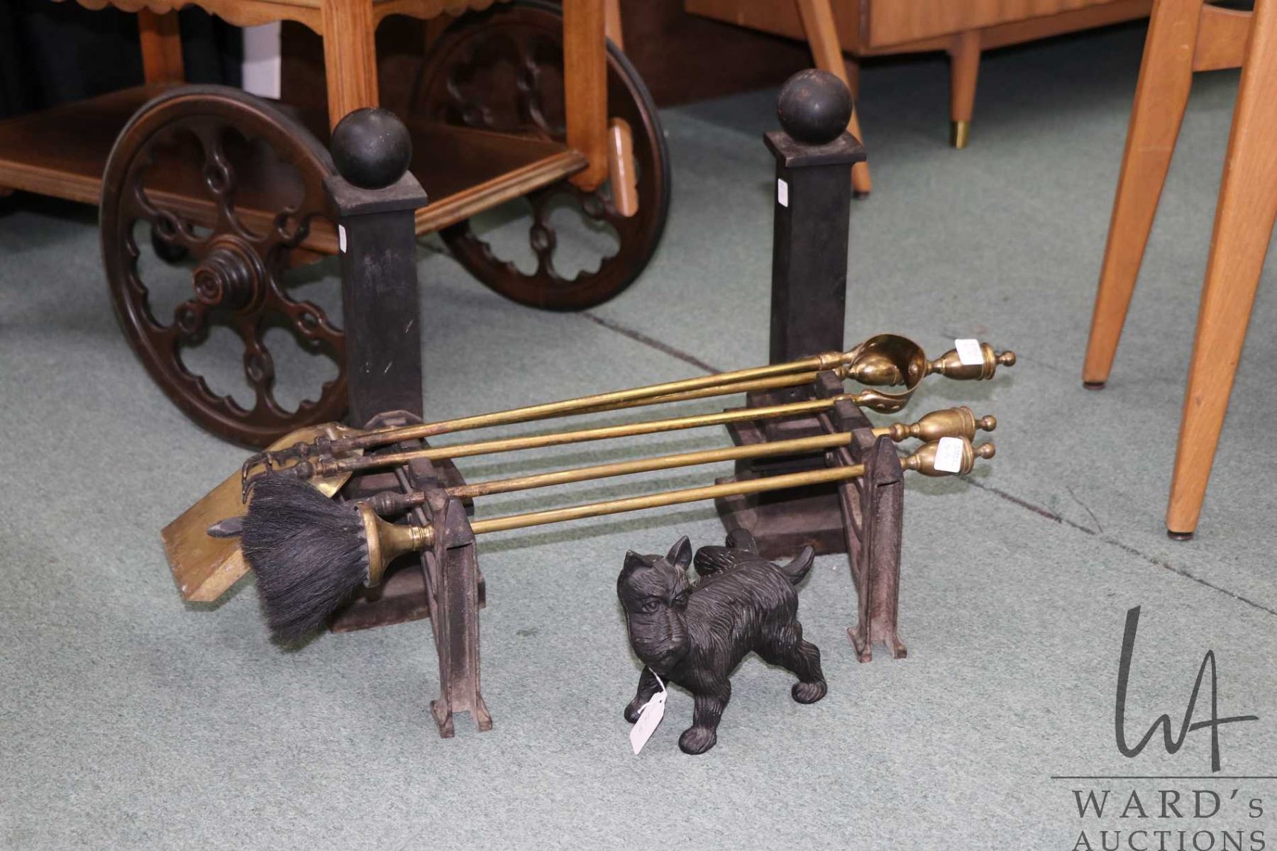 Selection of metalwares including cast Scottie dog door stop, antique andirons and brass companion set
