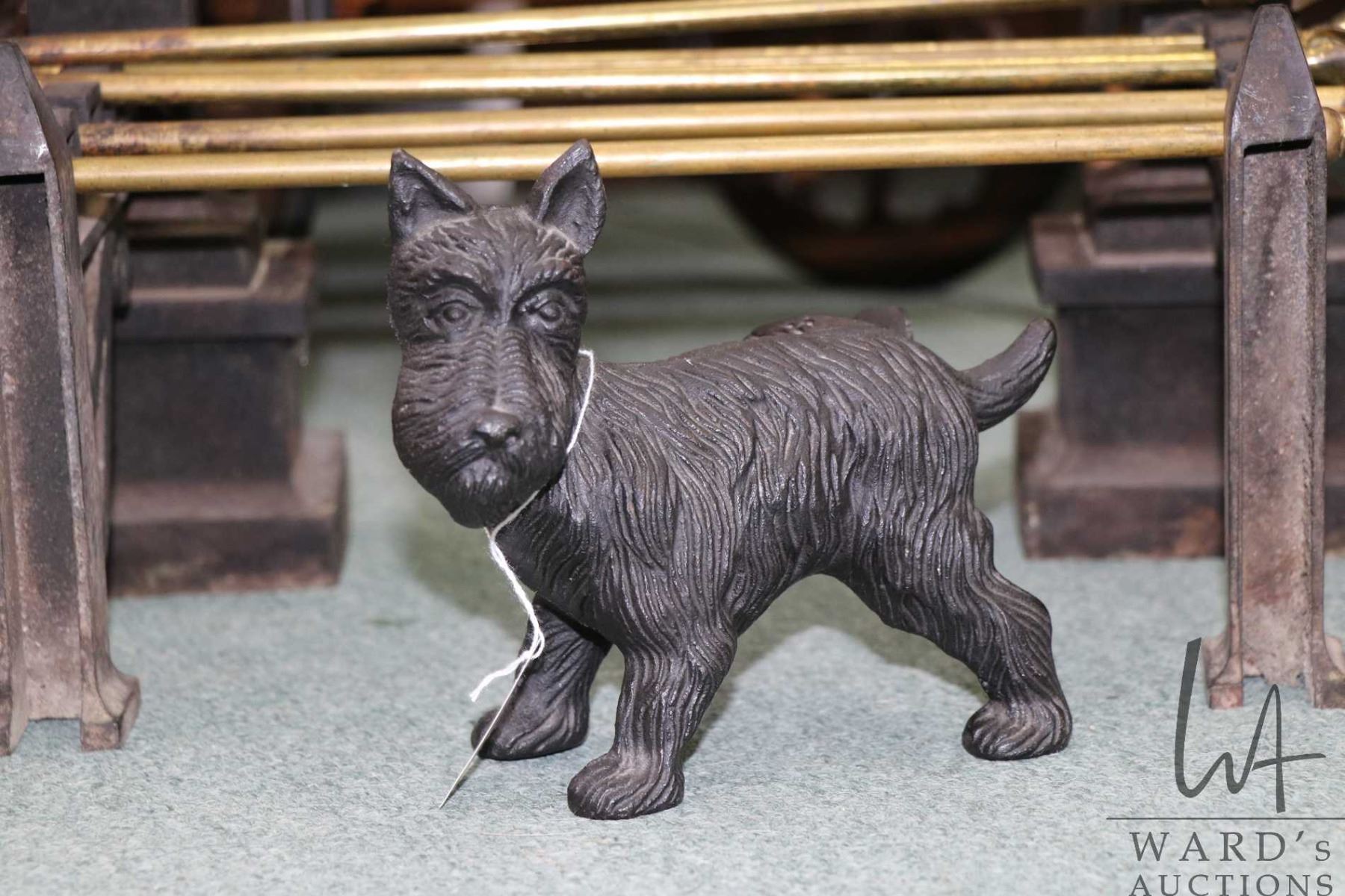 Selection of metalwares including cast Scottie dog door stop, antique andirons and brass companion s
