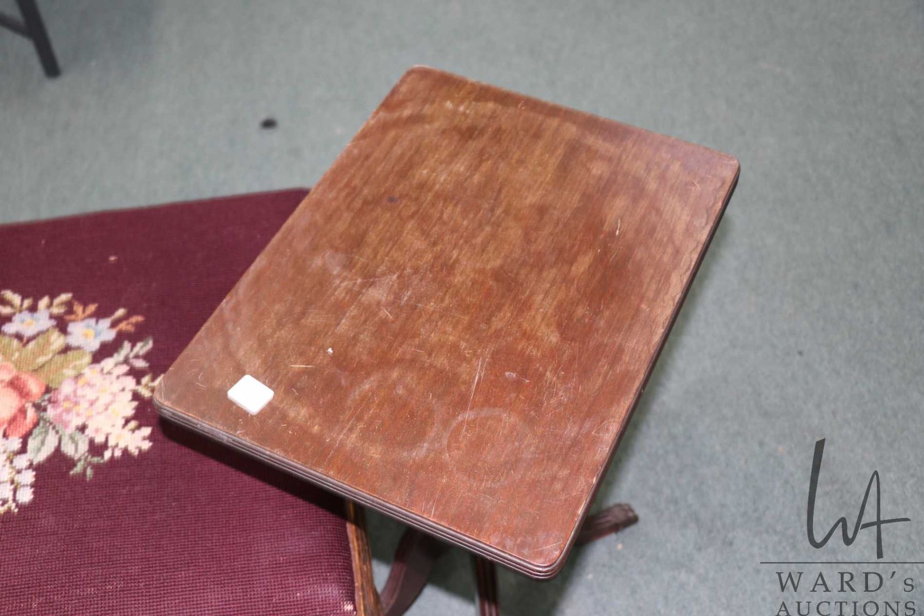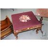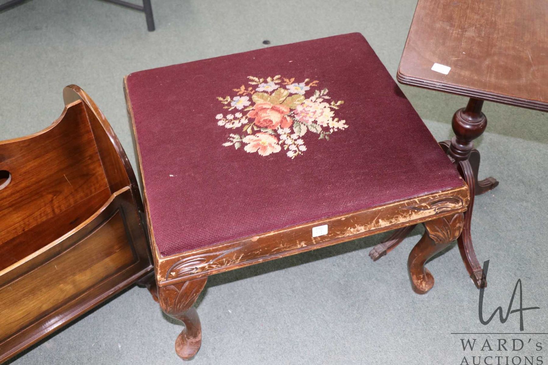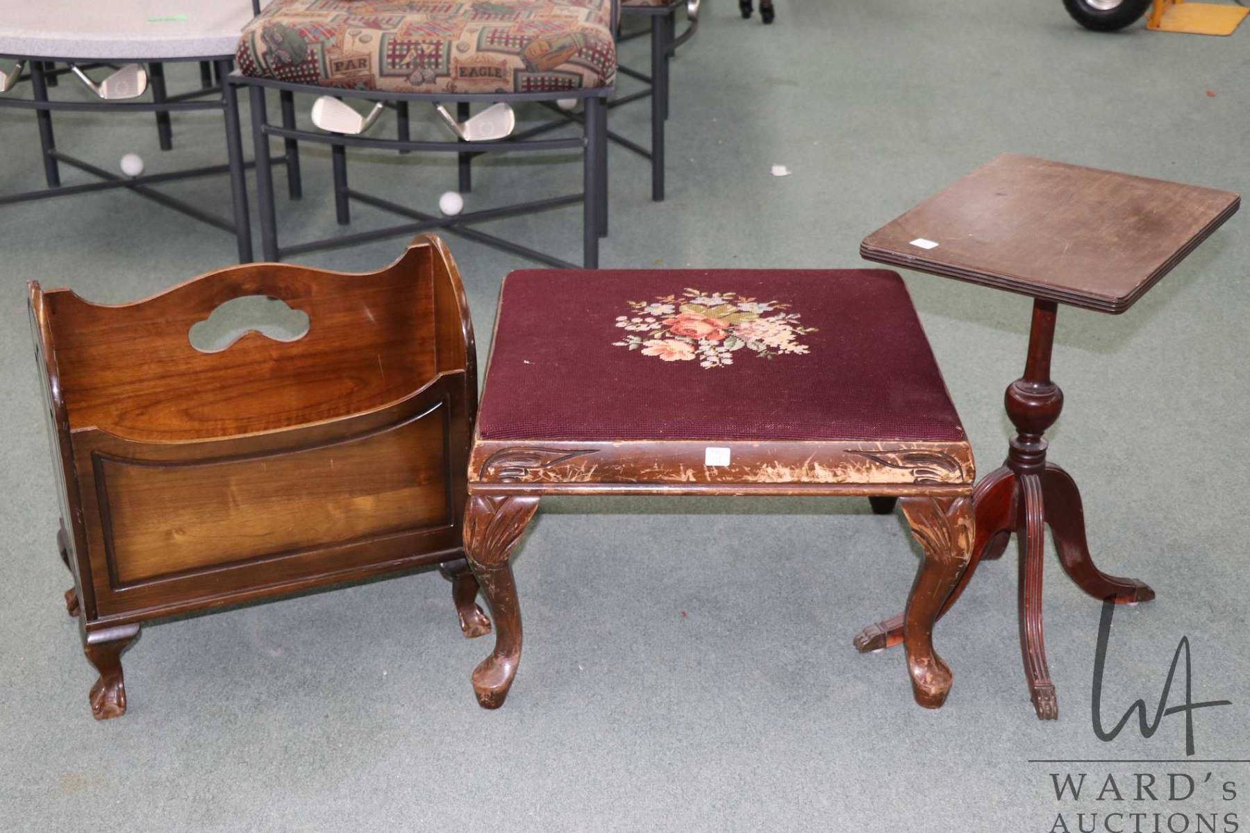 Selection of mid 20th century furniture including needlepoint upholstered stool, center pedestal wine table and book/ magazine rack with ball and claw feet