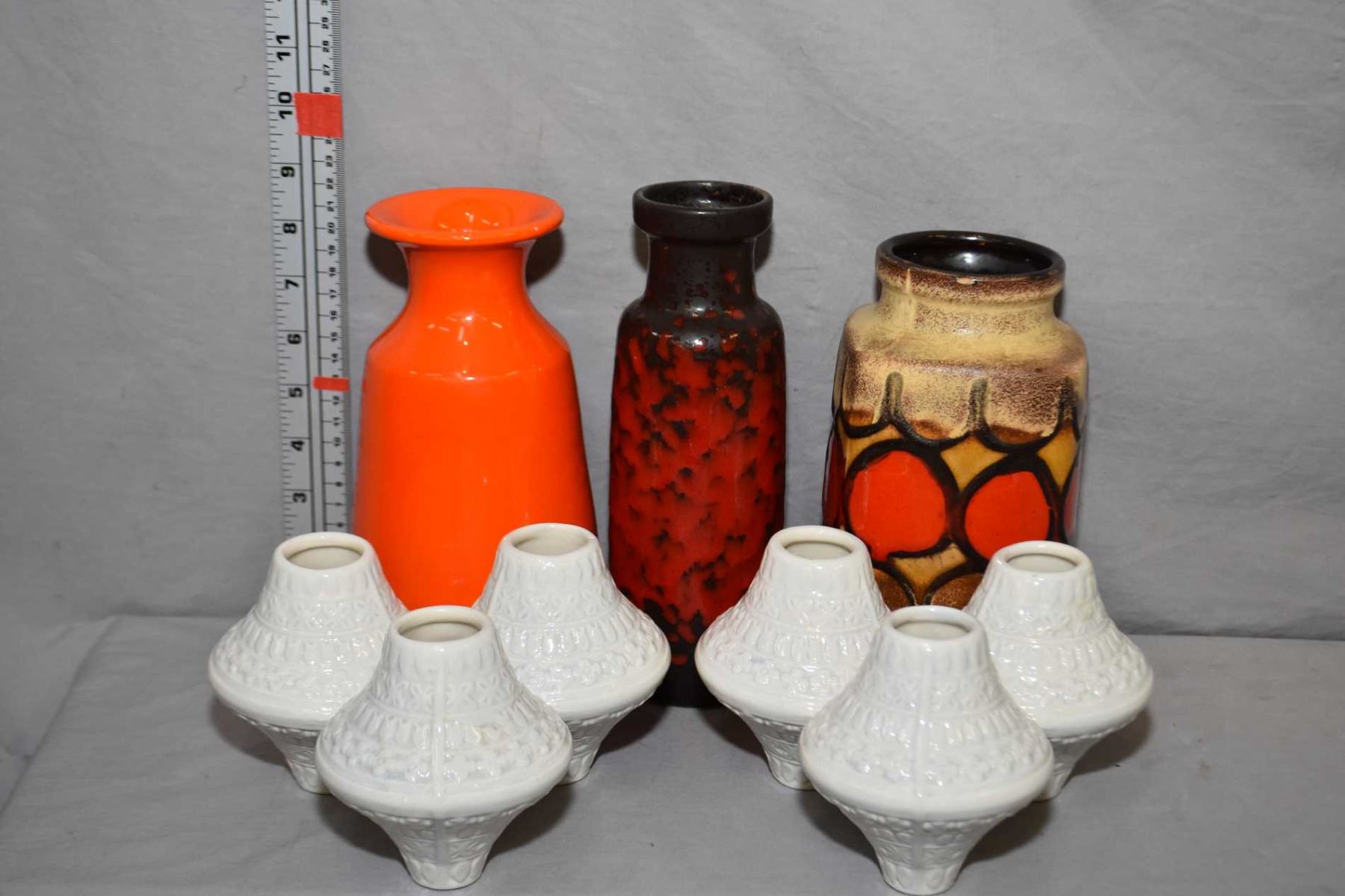 Selection of mid century glazed pottery including 9" vases, pair of three candle holders and a German pottery vase