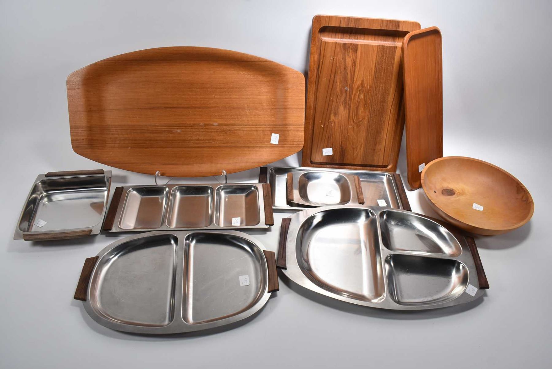 Selection of mid century teak and stainless tableware including Atka Bangkok Teak made in Sweden tray, cutting board made in Denmark made by Nissen etc. plus a turned birch bowl signed Damsey