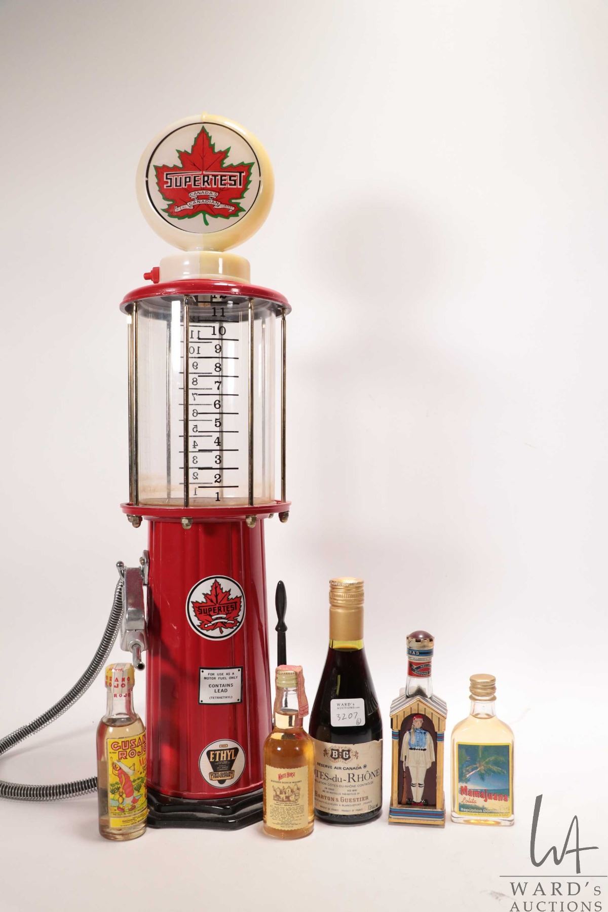 Selection of miniature bottles including White Horse/ Blended Scotch Whisky / Ouzo/ Mezcal/ Mamajuana Lolita/ plus a Barton & Gustier Single Serving Air Canada Reserve Wine plus a gas pump motif liquor dispenser