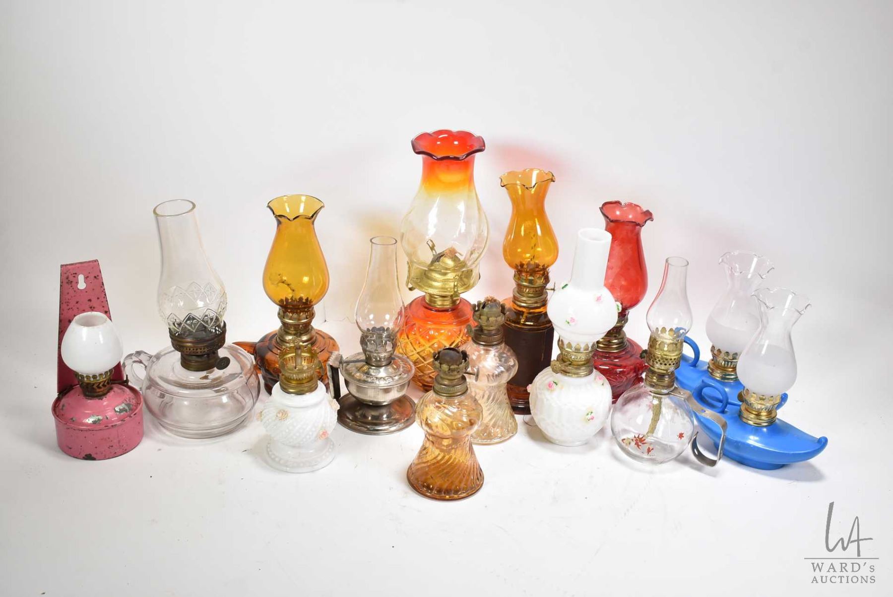 Selection of miniature oil lamps, various sizes and shapes including coloured glass etc.