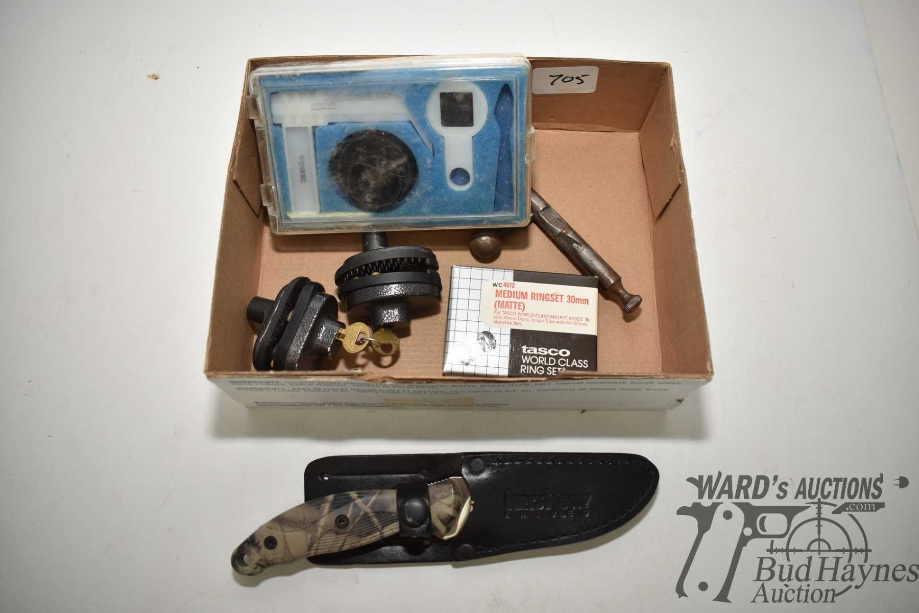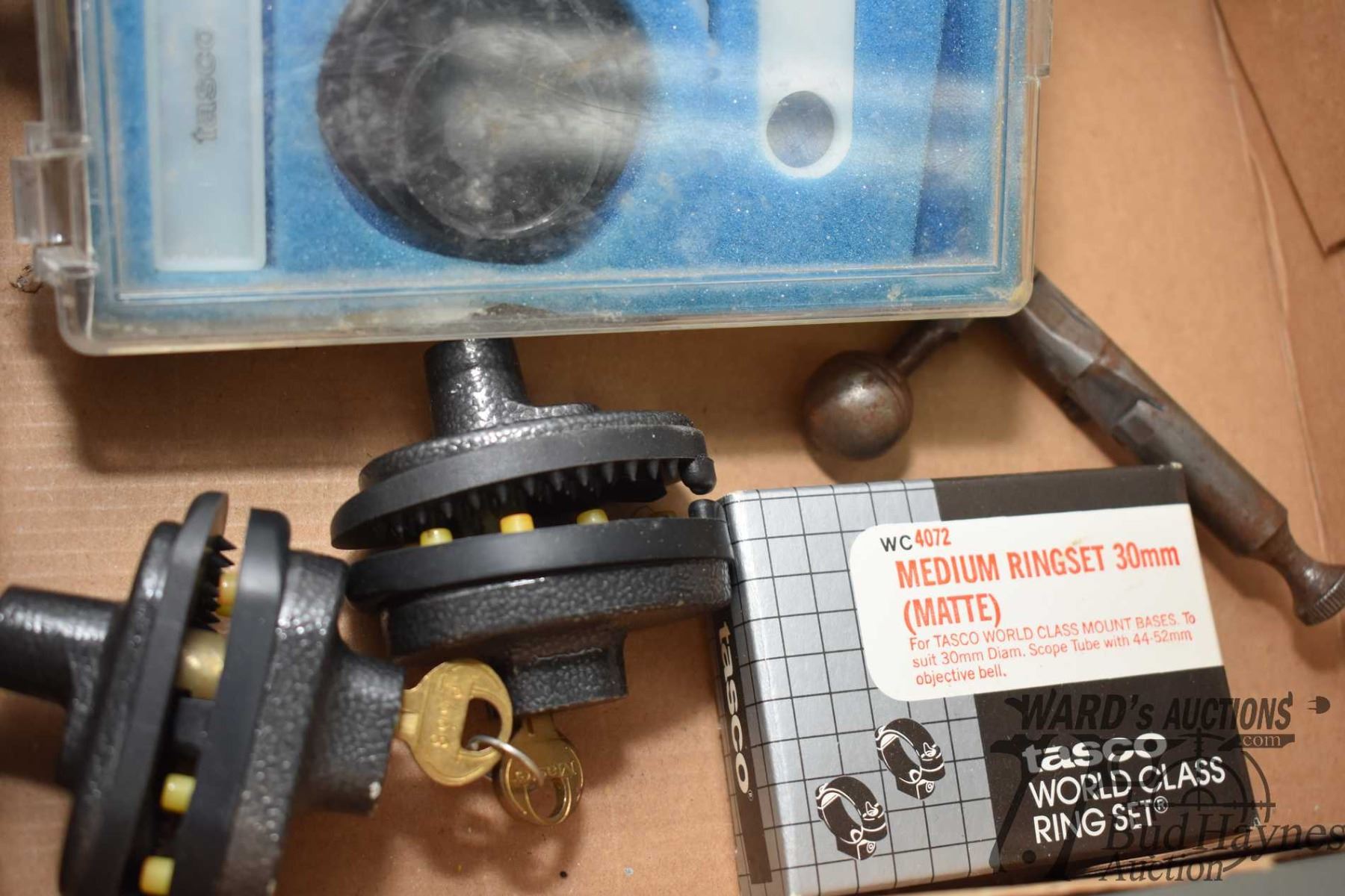 Selection of misc. including Tasco scope guide No.29C, a Kershaw RMEF knife w/ leather sheath, two trigger locks, set of Tasco 30mm scope rings, and an unknown rifle bolt