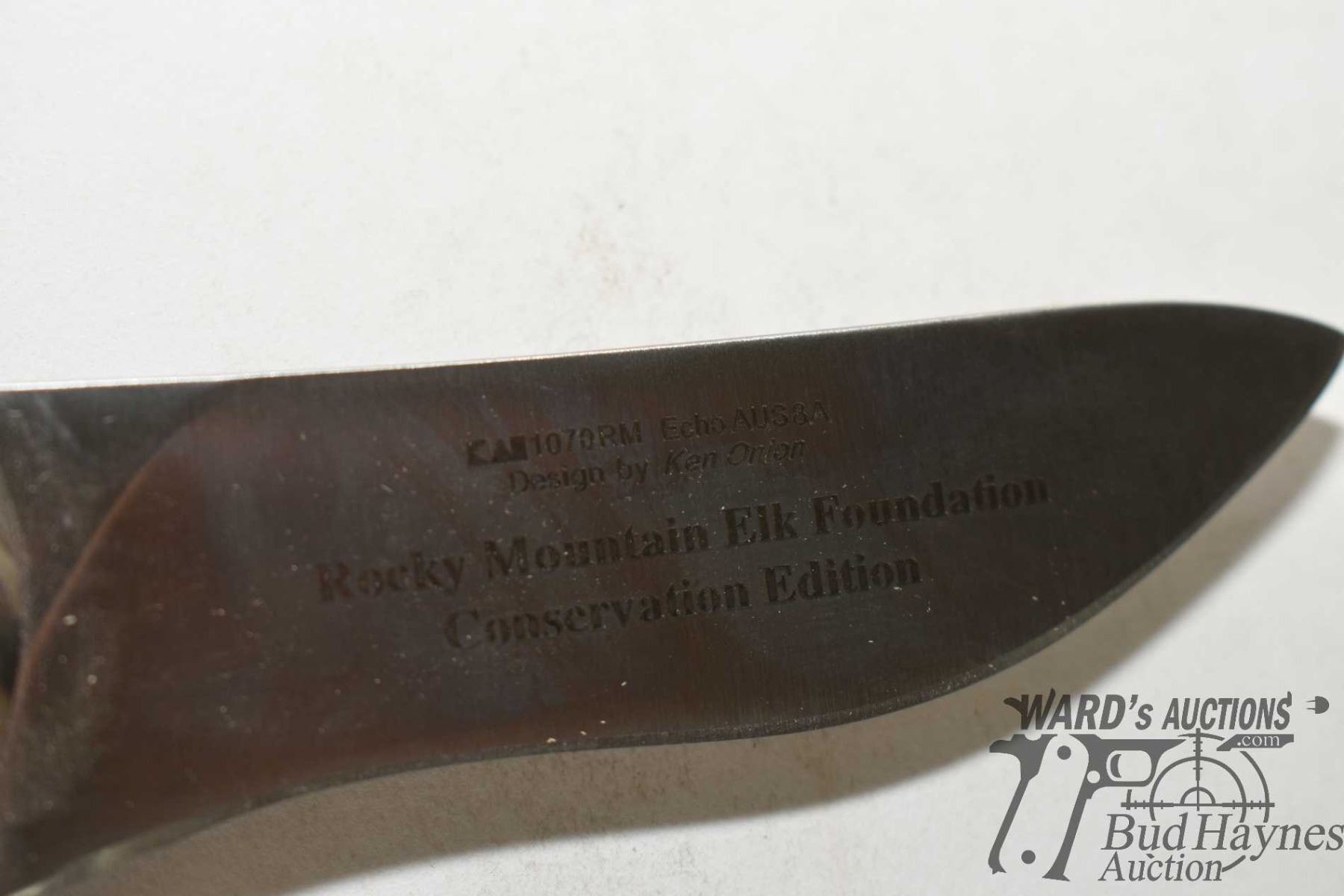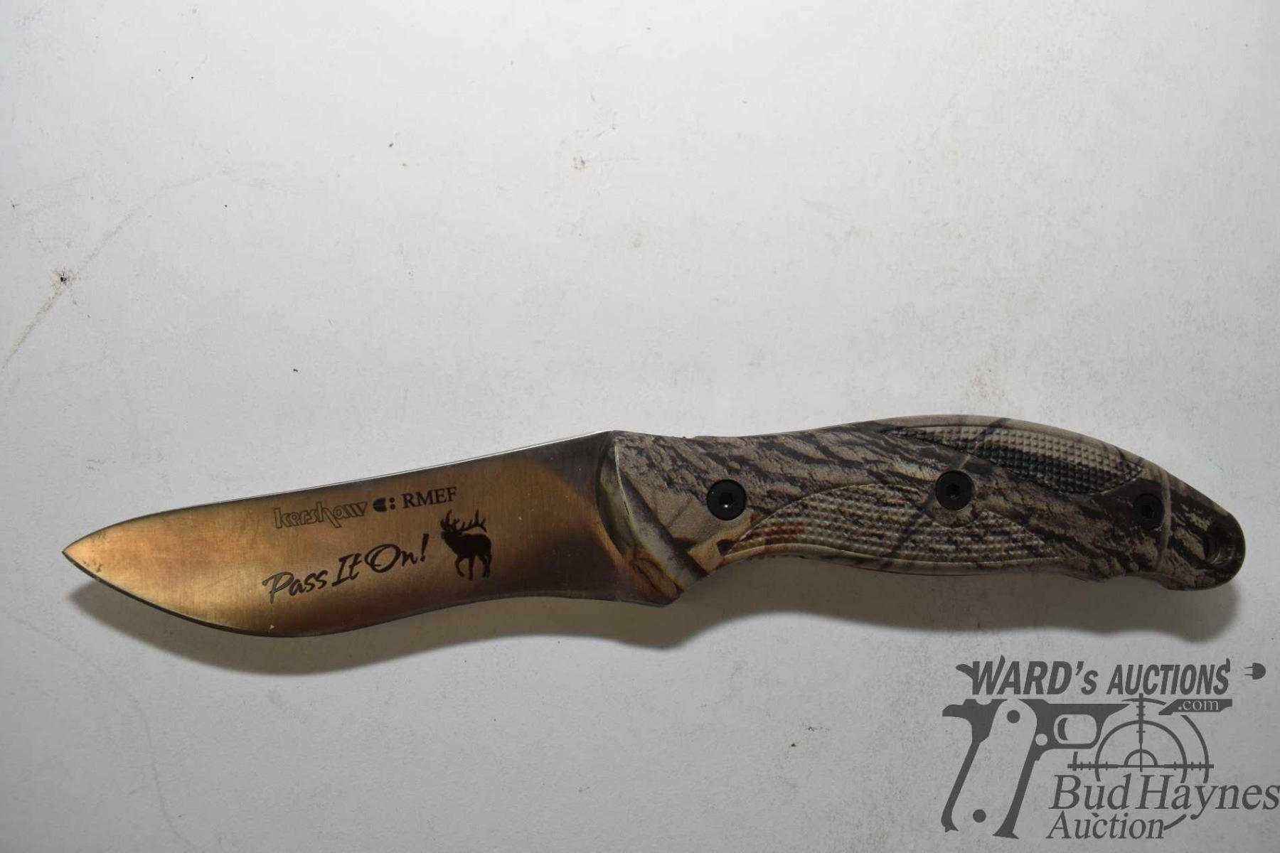 Selection of misc. including Tasco scope guide No.29C, a Kershaw RMEF knife w/ leather sheath, two t