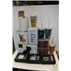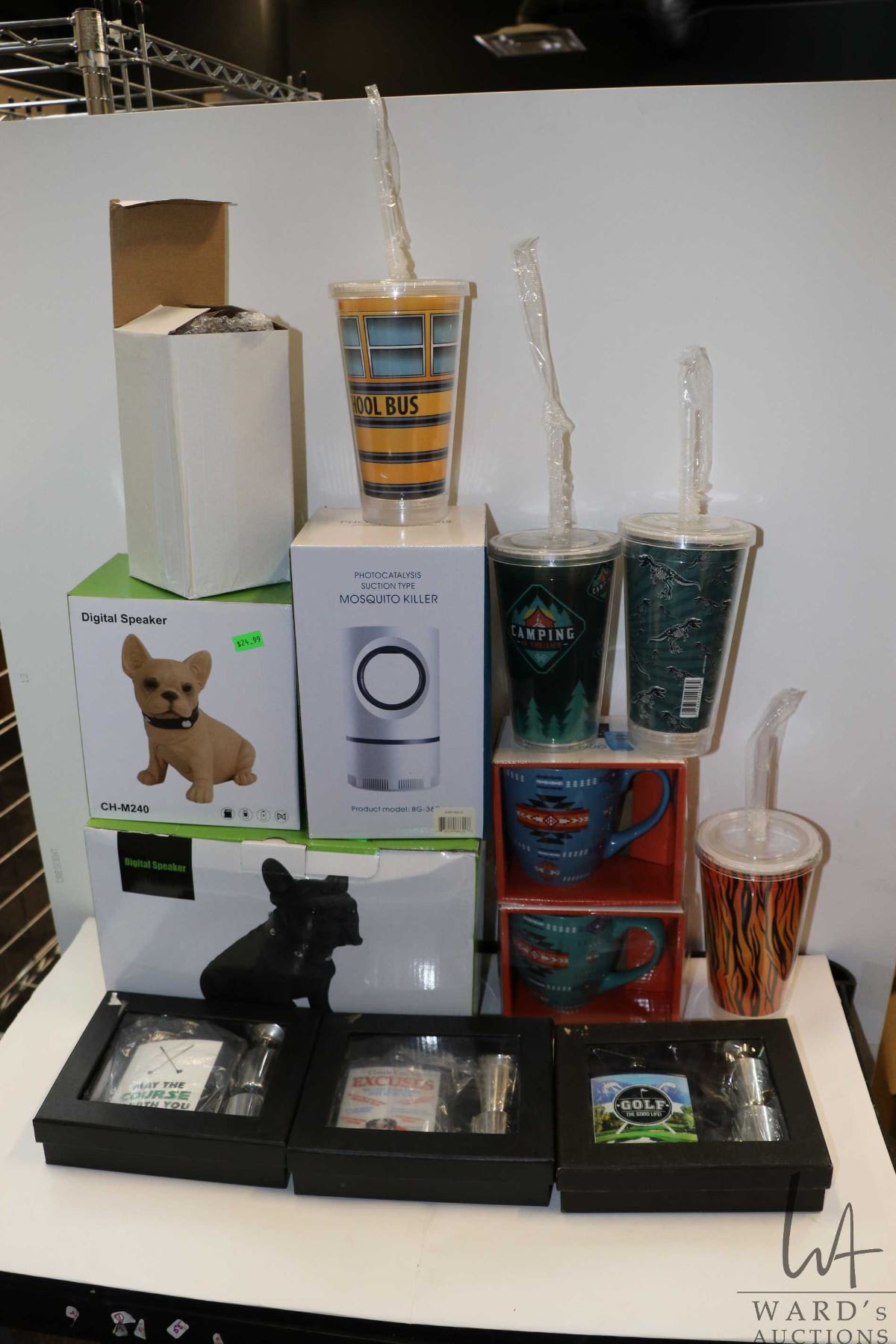 Selection of misc. items including 3 plastic cups w/ lids & straws, 2 dog speakers, mosquito killer, shot glass kits, etc