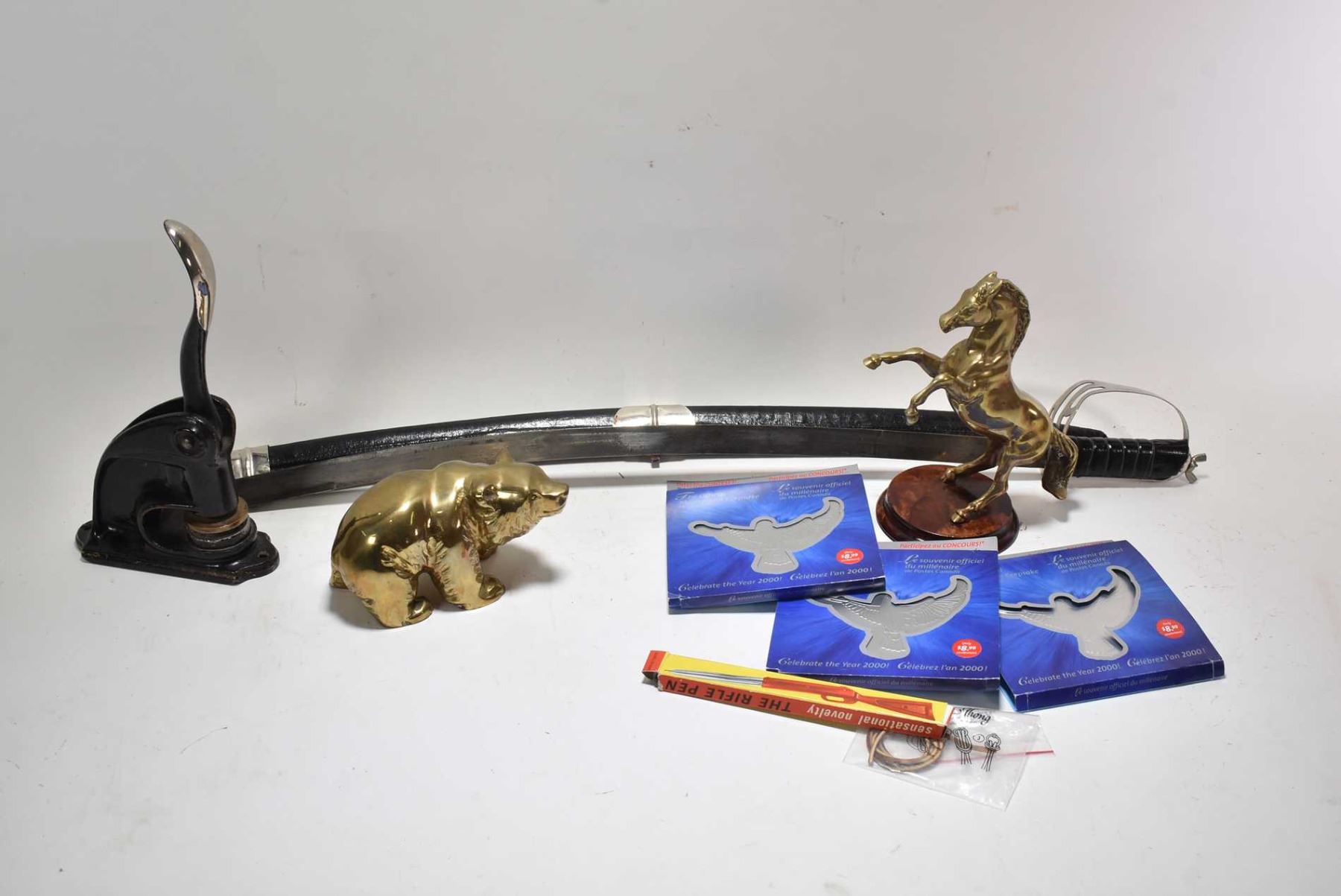 Selection of miscellaneous including a decorative sword, two brass animals including a bear and a rearing horse, a corporate seal, a rifle Win-Chester pen in box and three Millenium Canada Post coin sets