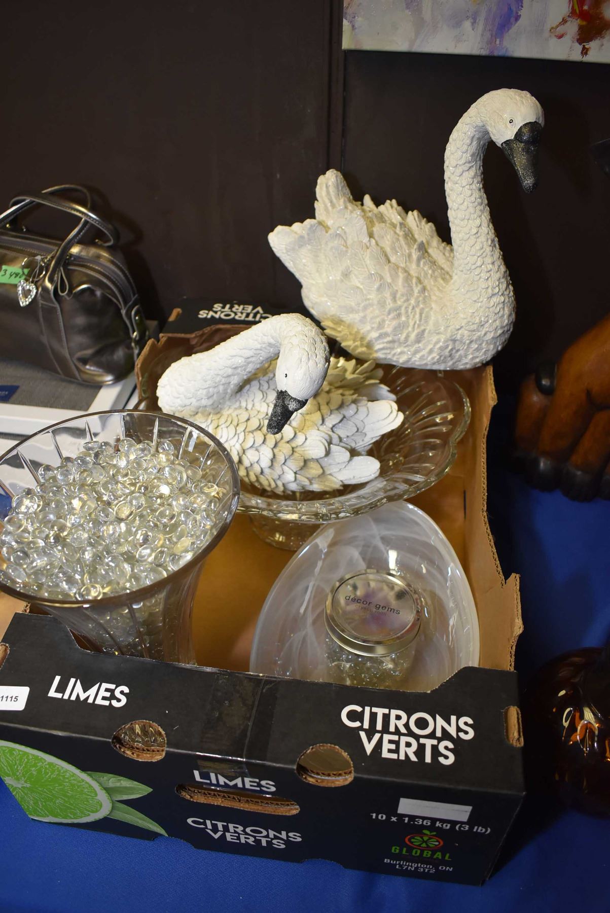 Selection of modern decor including center bowl, art glass bowl with a selection of glass beads, swans etc.