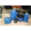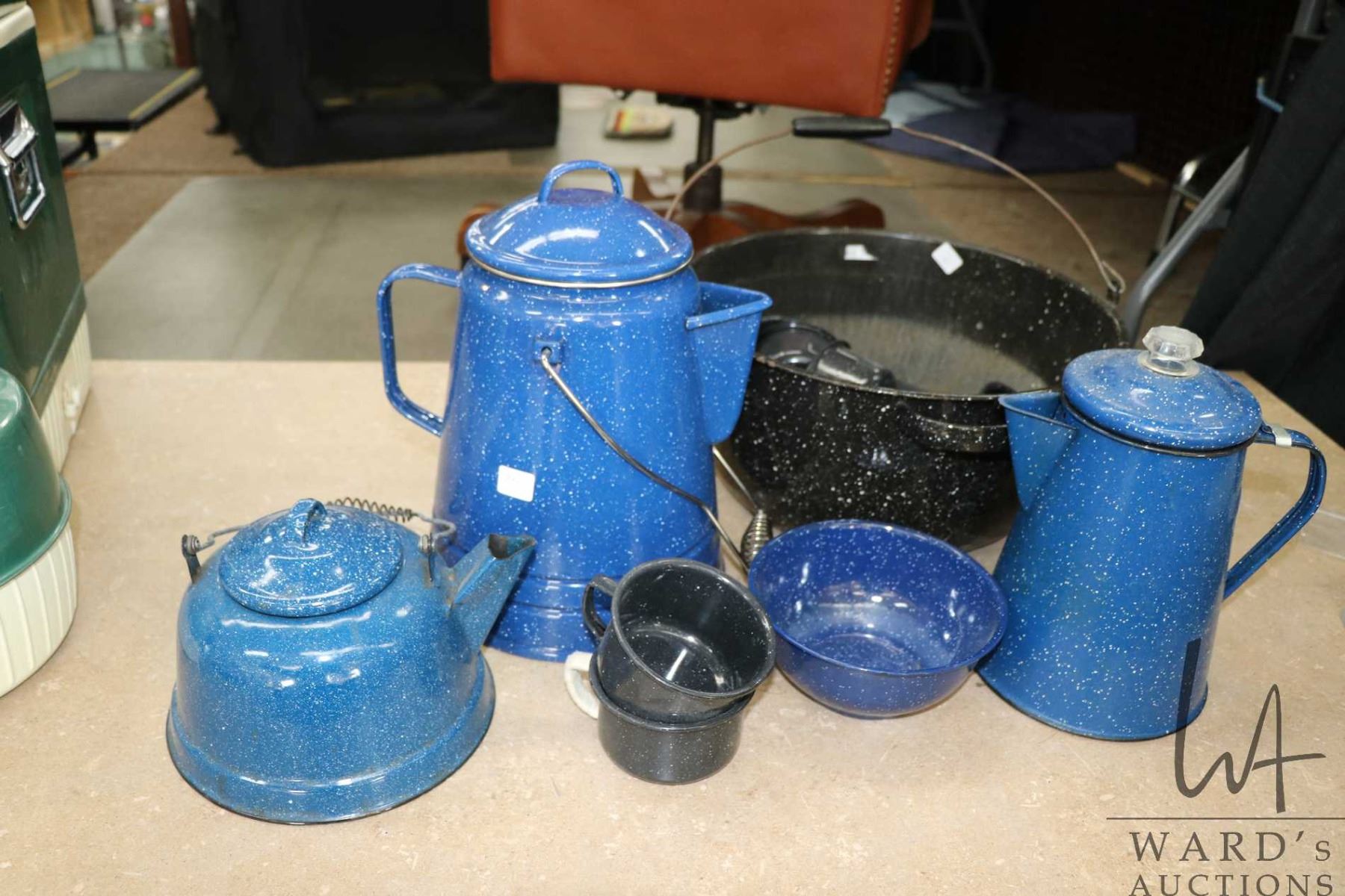 Selection of modern enamel cookware including 15" diameter handled pot, jug, kettle, coffee percolator, plates, cups etc.
