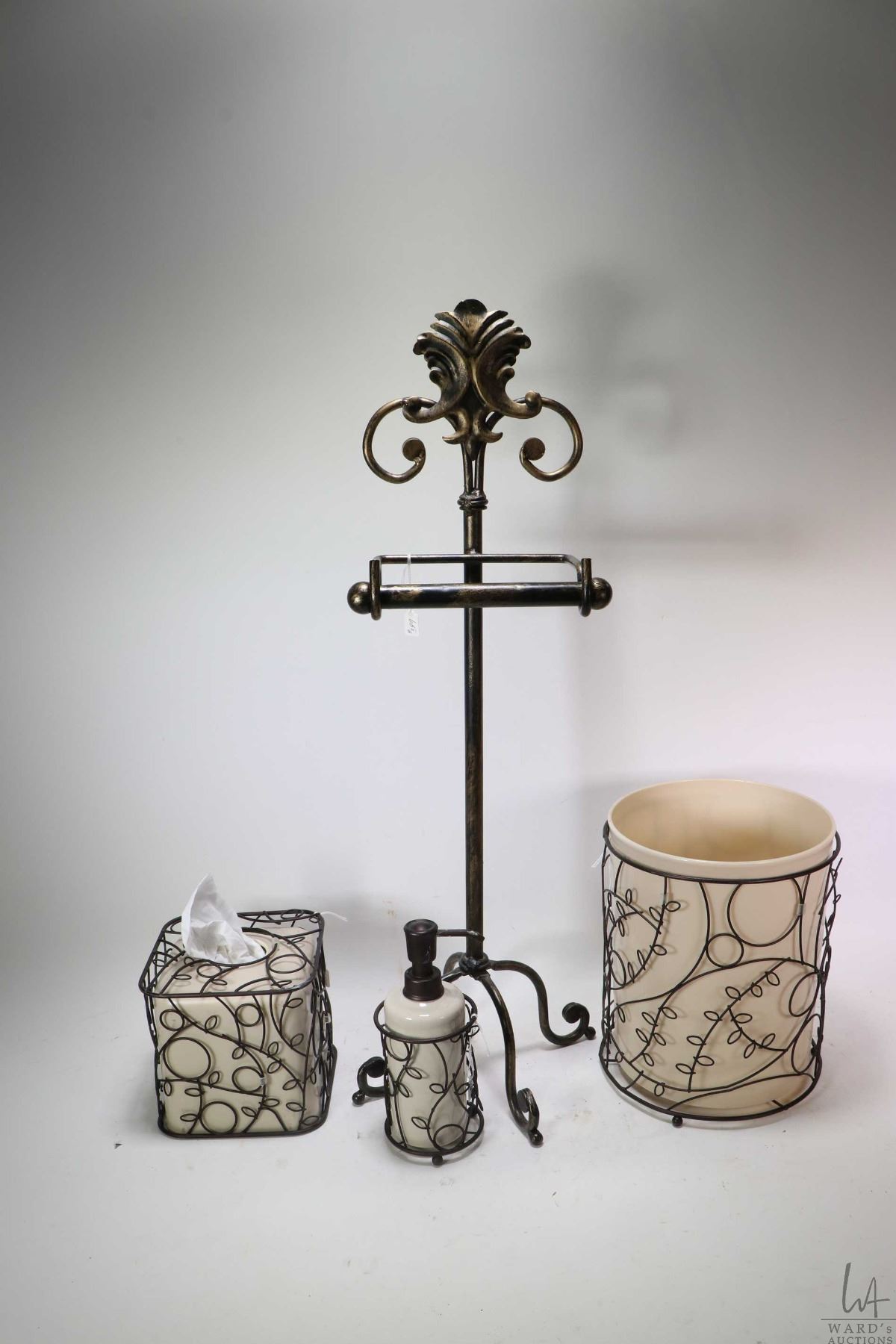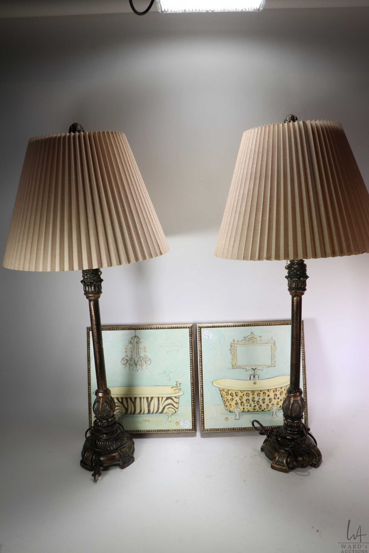 Selection of modern home decor items including bathroom accessories, two framed and two antiqued finish table lamps