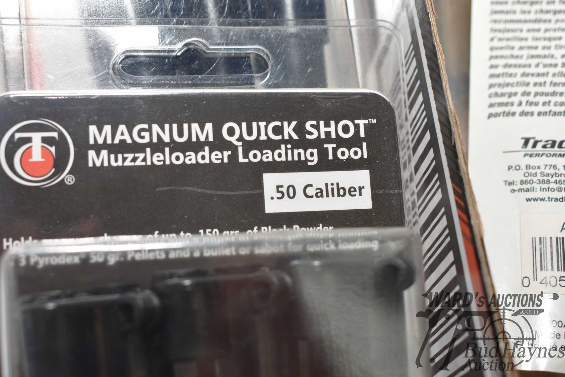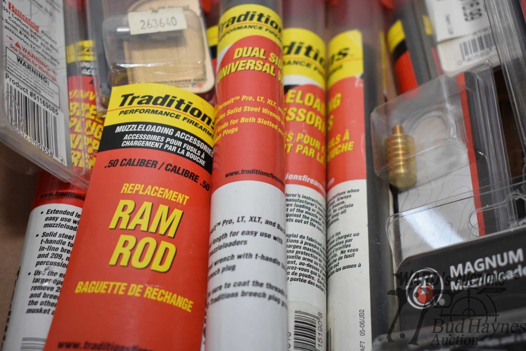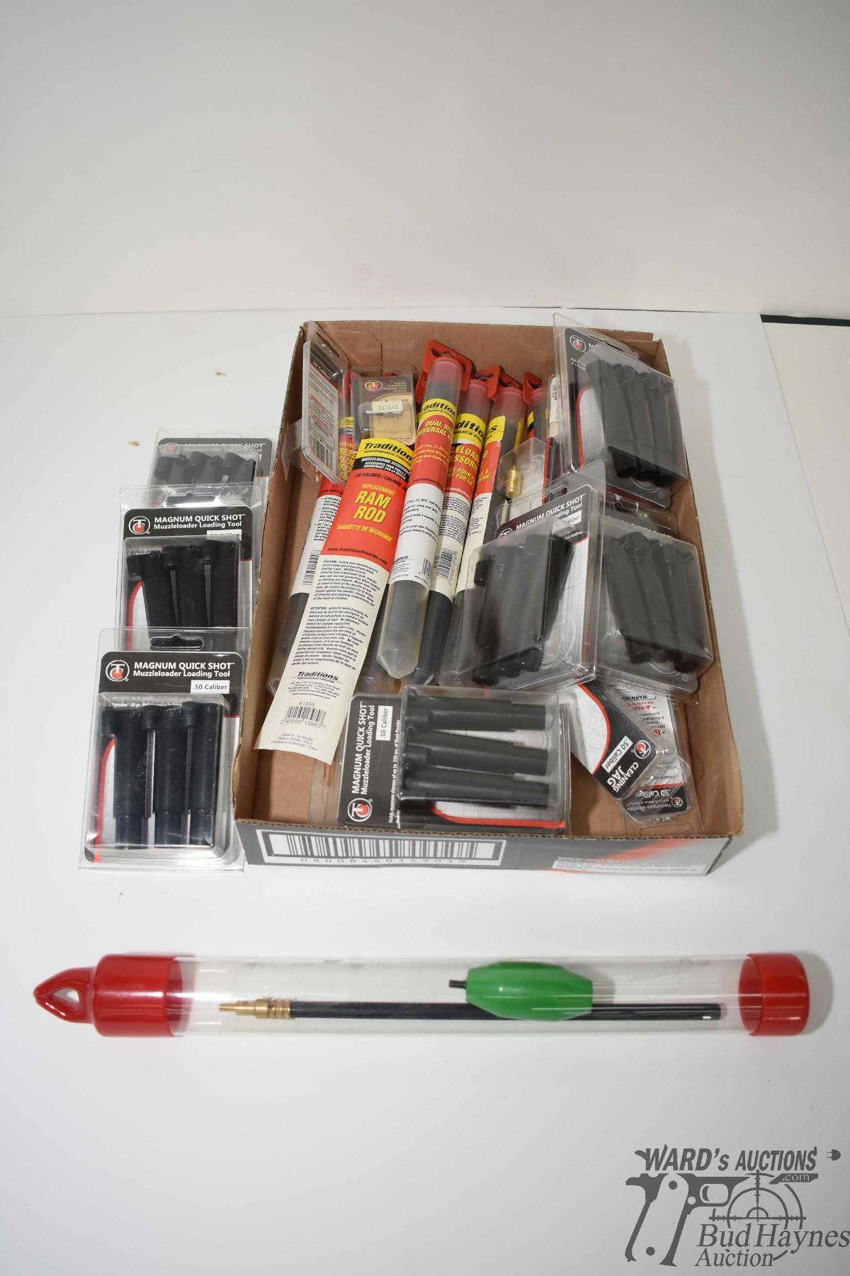 Selection of muzzleloader accessories including muzzleloading loading tool, cleaning jags, duel sided universal wrenches, ram rod, Thunder Dome Breech plugs, etc