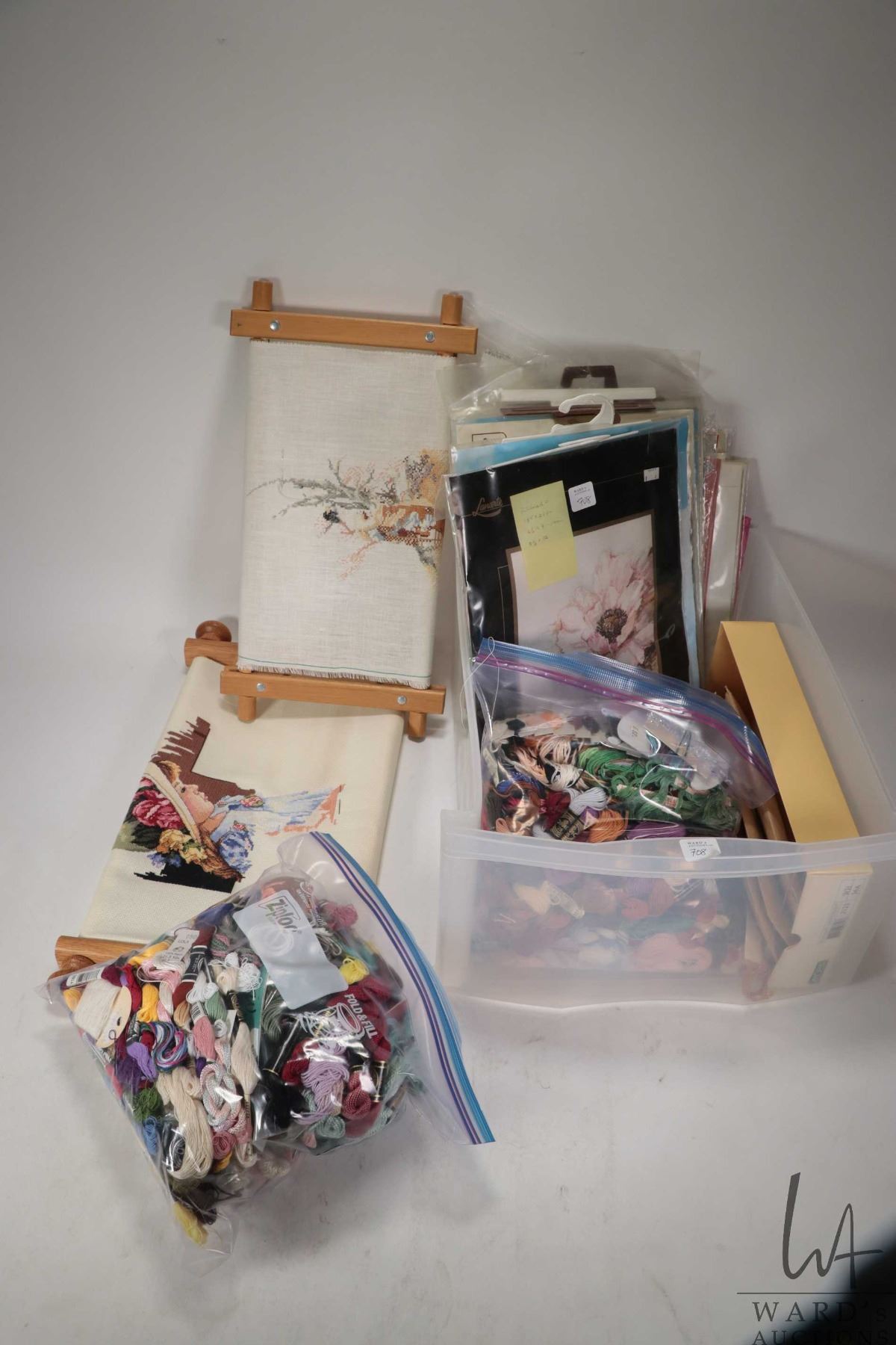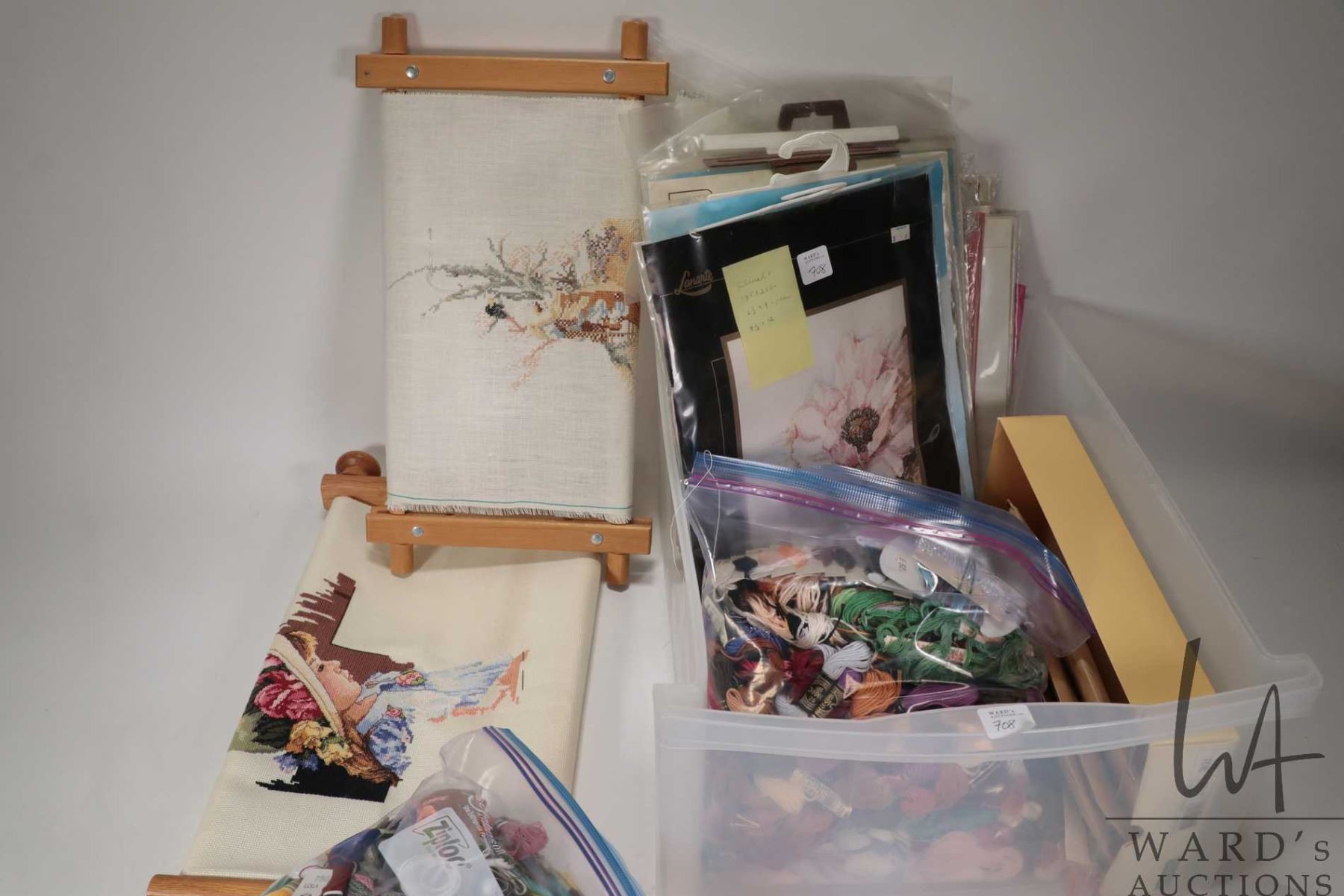 Selection of needlecraft kits and two large bags of embroidery floss plus two started embroidery pro