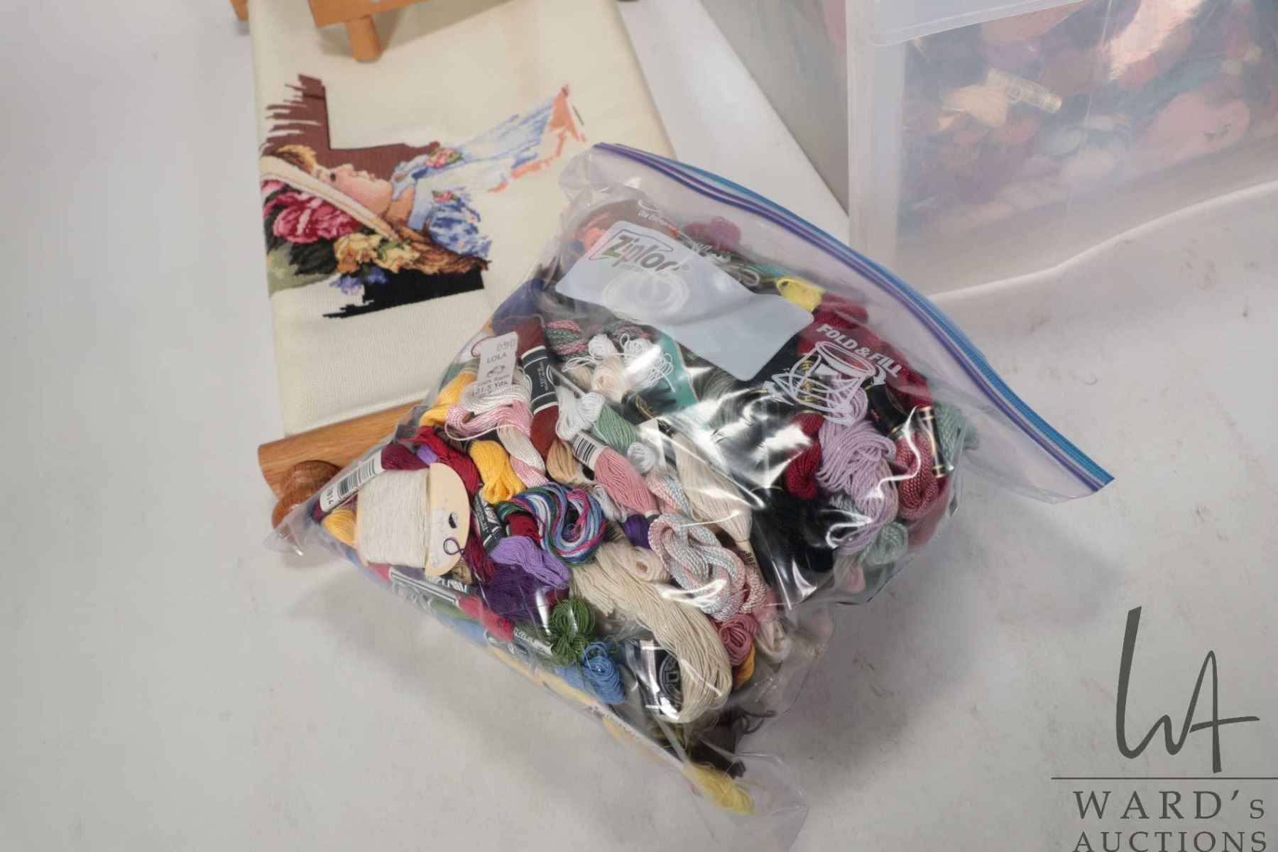 Selection of needlecraft kits and two large bags of embroidery floss plus two started embroidery projects on wooden frames