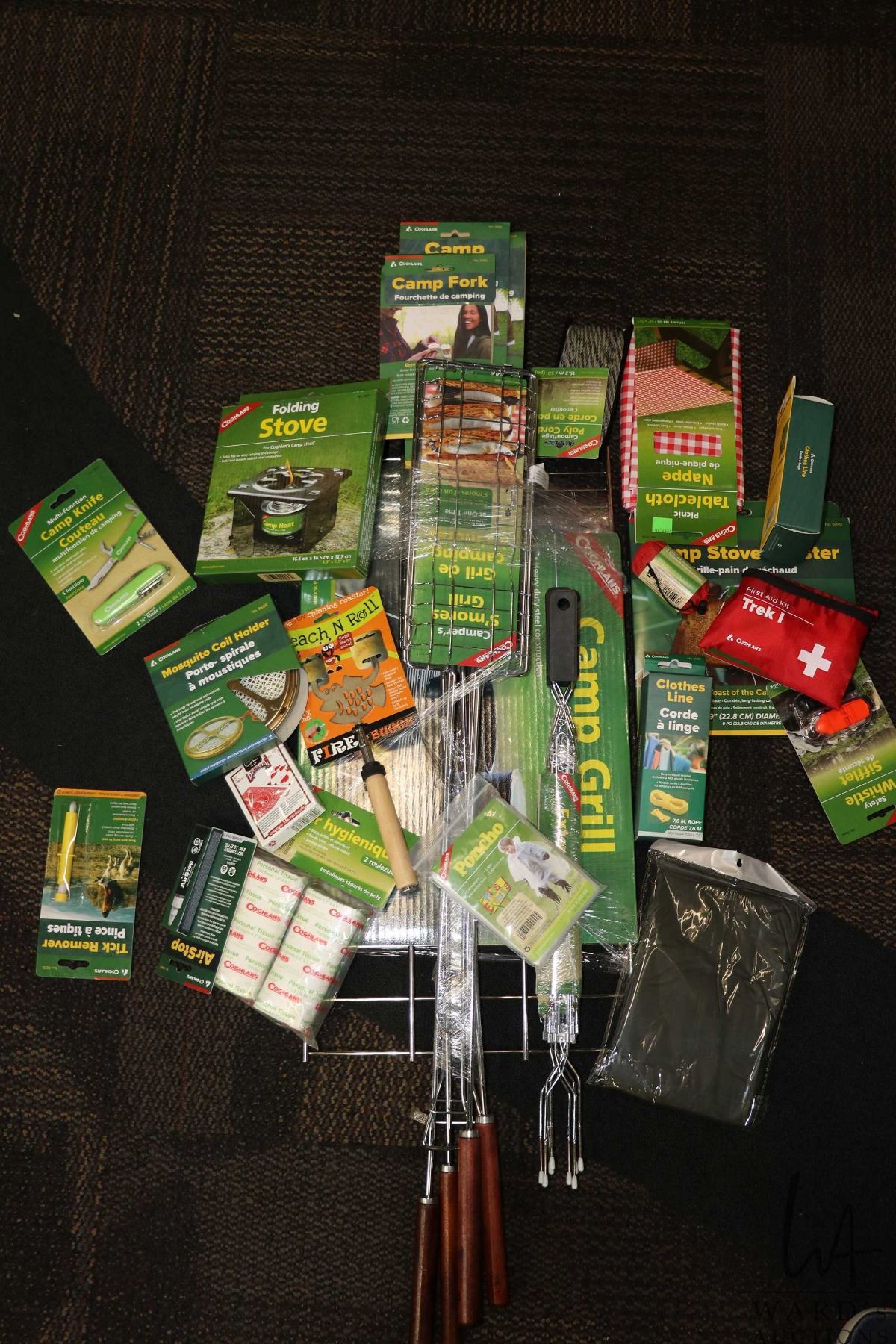 Selection of new in packaging camping accessories including Smores Grills, toasting forks, campfire grill, camp stove toaster, folding stove, first aid kit, clothesline, mosquito coil, etc