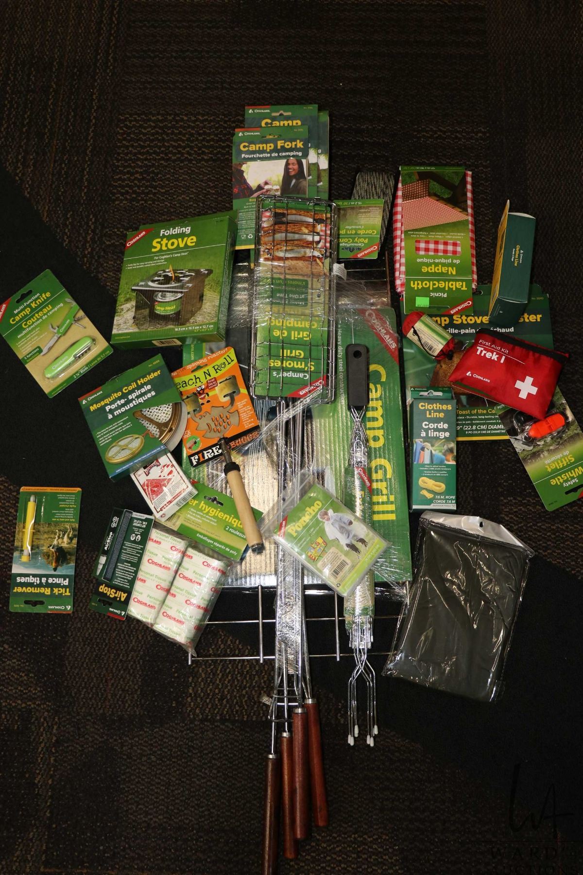 Selection of new in packaging camping accessories including Smores Grills, toasting forks, campfire grill, camp stove toaster, folding stove, first aid kit, clothesline, mosquito coil, etc