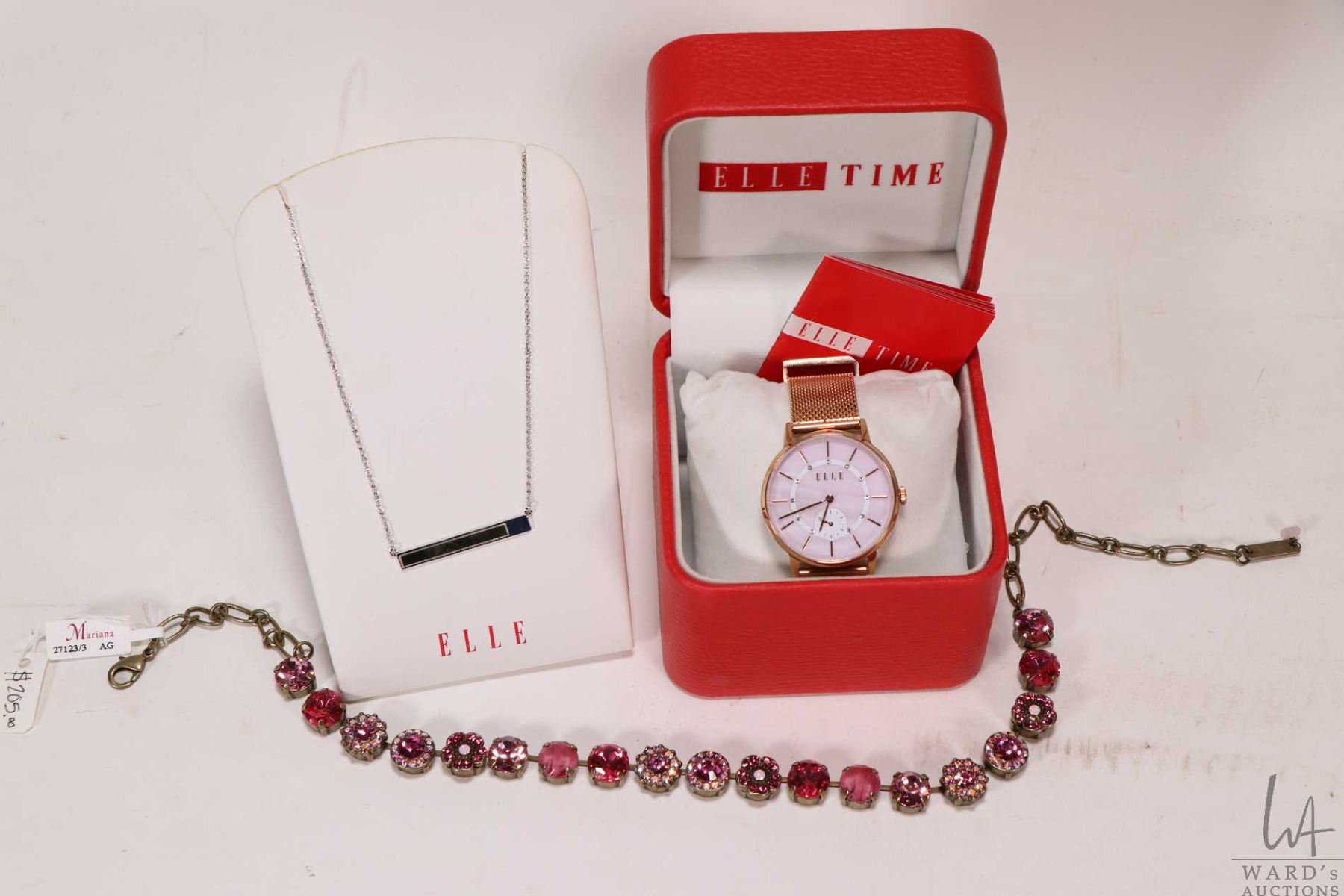 Selection of new jewellery including Elle "Time" rose gold plated watch with pink enamel dial, a Ell