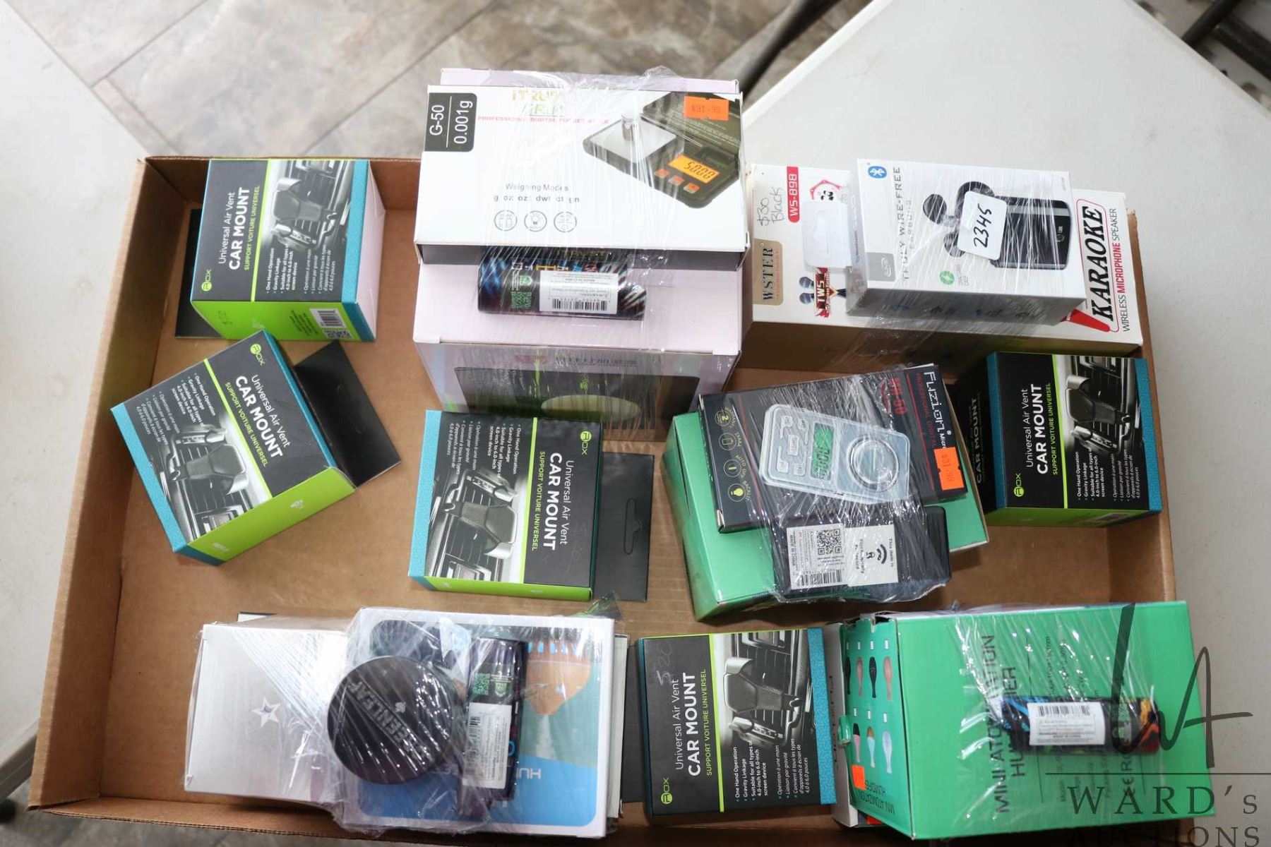 Selection of new products including humidifiers, car phone mount, scales, head phones, Karaoke mic,